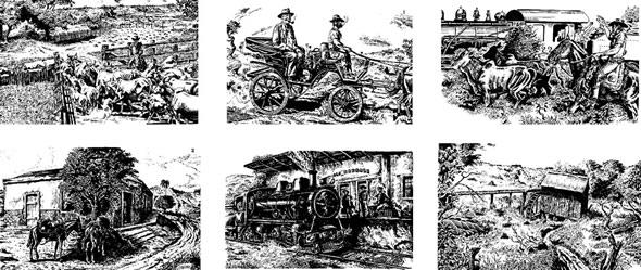 Ilustrações do Prof. Vinício Aloise sobre os domínios do Conde de Serra Negra, a chegada da Estrada de Ferro Sorocabana - EFS, o Dr. Costa Leite de trole e as paisagens da Vila de Vitória (Vitoriana).
