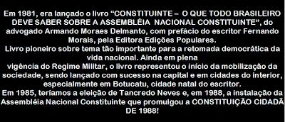 O QUE TODO BRASILEIRO DEVE SABER SOBRE A ASSEMBLÉIA NACIONAL CONSTITUITE”, que fizemos no ano de 1981, durante a campanha a favor da instalação de uma CONSTITUINTE que restituiria à Nação o pleno Estado de Direito, com a promulgação de uma Constituição Democrática e a realização de eleições livres e diretas.