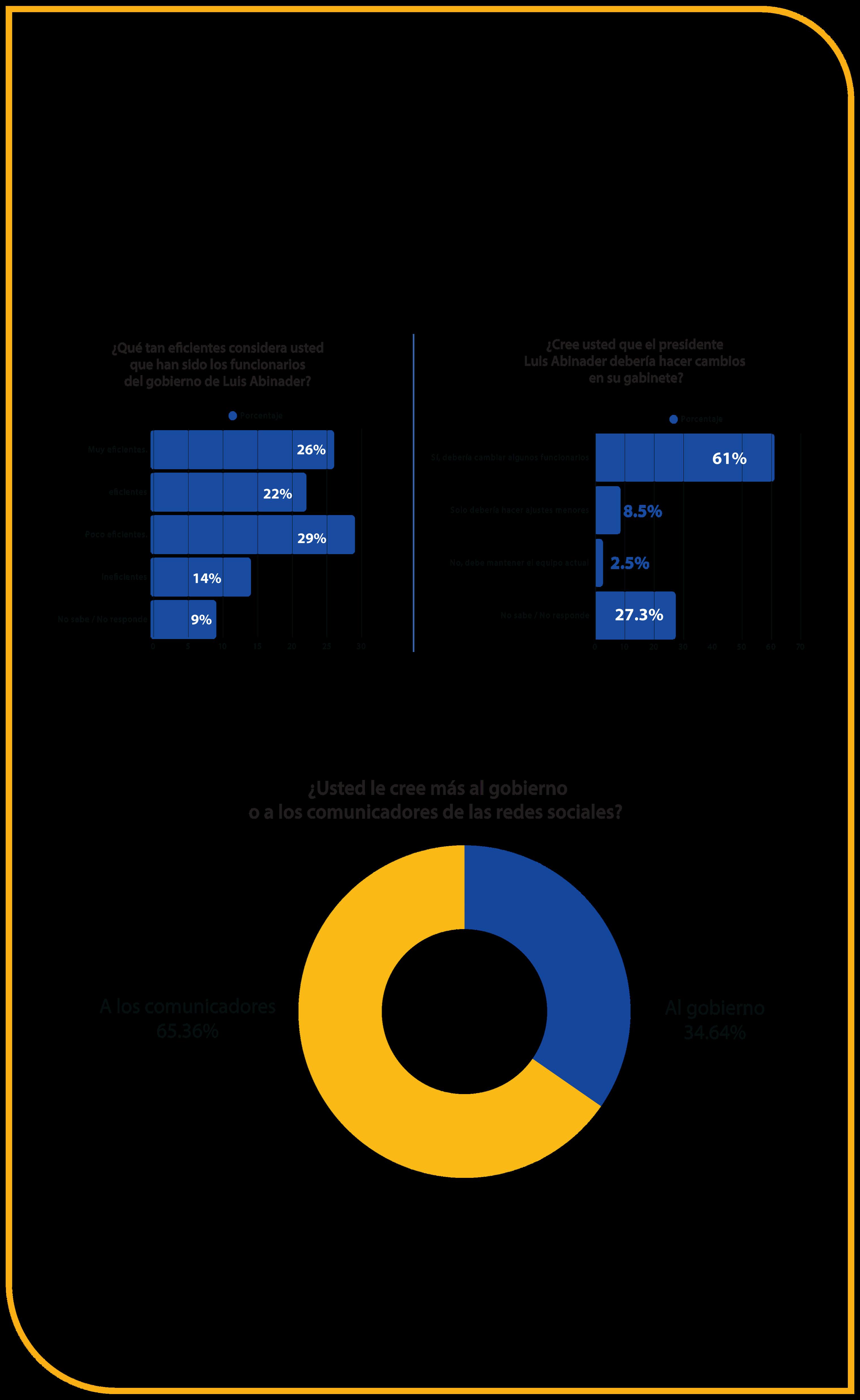 Los dominicanos tienen opiniones divididas sobre la eficiencia del equipo de gobierno del presidente Luis Abinader De acuerdo con una encuesta nacional, el 43 % califica a los funcionarios como " muy eficientes" (26 %) o "eficientes" (22 %), mientras que un 29 % opina que han sido " poco eficientes"