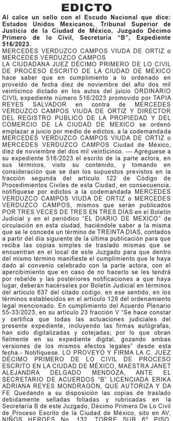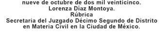 Al margen un sello con el Escudo Nacional que dice: ESTADOS UNIDOS MEXICANOS, TRIBUNAL SUPERIOR DE JUSTICIA DE LA CIUDAD DE MÉXICO, JUZGADO: 55° CIVIL DE PROCESO ESCRITO, EXP. No. 39/2008, SECRETARÍA “A”. En cumplimiento a lo ordenado en auto de dieciocho de noviembre de dos mil veinticinco y veinticinco de septiembre de dos mil veinticuatro, deducido del expediente 39/2008, relativo al juicio EJECUTIVO MERCANTIL, promovido por GUTIÉRREZ ZINTZUN RICARDO CESIONARIO DE CIBANCO, S.A. INSTITUCIÓN DE BANCA MÚLTIPLE, EN SU CARÁCTER DE FIDUCIARIO EN EL FIDEICOMISO F/00782 ANTES THE BANK OF NEW YORK MELLON, S.A. INSTITUCIÓN DE BANCA MÚLTIPLE en contra de MARIA GONZALEZ ARANDA, el C. JUEZ QUINCUAGÉSIMO QUINTO DE LO CIVIL DE PROCESO ESCRITO, DE LA CIUDAD DE MÉXICO, por Ministerio de Ley, dictó el primer auto antes descrito que su parte conducente dice... se señalan las CATORCE HORAS DEL DÍA VEINTISÉIS DE ENERO DEL AÑO DOS MIL VEINTISÉIS, para que tenga verificativo la diligencia ordenada en auto de fecha veinticinco de septiembre del año dos mil veinticuatro... NOTIFÍQUESE. Asimismo el segundo auto mencionado que en su parte conducente dice: se advierte que la demandada fue única y exclusivamente emplazada por medio de edictos, no así fue requerida de pago y embargo, al tratarse de un juicio ejecutivo mercantil. Ahora bien, tomando en consideración que la diligencia de embargo se inicia con el requerimiento de pago al demandado y que de no hacerse el pago, se requerirá al mismo, para que señale bienes suficientes para garantizar las prestaciones reclamadas, con el apercibimiento que de no hacerlo, el derecho para señalar bienes pasará al actor, al tratarse de un acto personalísimo de la parte demandada el derecho de señalar bienes para su embargo, derecho que es irrenunciable, se desprende que la demandada, no dio cumplimiento a la sentencia interlocutoria de fecha ocho de agosto del año dos mil once e interlocutoria de fecha veintiuno de septiembre de dos mil veintitrés, dentro del término que se le concedió para tal efecto con fundamento en el artículo 1347 del Código de Comercio, SE DICTA AUTO DE EJECUCIÓN CON MANDAMIENTO EN FORMA, por lo que, deberá requerirse a la parte demandada en el acto de la diligencia, para que haga pago de la cantidad de $2,026,074.39 (DOS MILLONES VEINTISÉIS MIL SETENTA Y CUATRO PESOS 39/100 MONEDA NACIONAL), por concepto de suerte principal, comisiones, intereses ordinarios y moratorios, y demás prestaciones reclamadas y a las que fue condenada en sentencia definitiva dictada en autos, en caso de no hacerlo, embárguensele bienes suficientes de su propiedad para garantizar la cantidad referida, los que se pondrán en depósito de la persona que bajo su responsabilidad designe la parte actora en el momento de la diligencia, en consecuencia, en su oportunidad túrnense los presentes autos al C. Secretario Actuario de la adscripción, a efecto de dar cumplimiento a lo antes ordenado en tal razón, CÍTESE PERSONALMENTE A LA DEMANDADA MARÍA GONZÁLEZ ARANDA, para que comparezca al local de este Juzgado a señalar bienes de su propiedad que garanticen el pago de la cantidad de $2,026,074.39 (DOS MILLONES VEINTISÉIS MIL SETENTA Y CUATRO PESOS 39/100 MONEDA NACIONAL), por concepto de suerte principal, comisiones, intereses ordinarios y moratorios y demás prestaciones reclamadas y demás prestaciones señaladas en el escrito inicial de demandada, apercibido que de no hacerlo el derecho pasara a la parte actora, de conformidad con lo establecido en el artículo 1394 del Código de Comercio, es PROCEDENTE NOTIFICAR por medio de EDICTOS, y para tal efecto publíquese en el periódico de circulación amplia y cobertura nacional “EL DIARIO DE MÉXICO”, y en el periódico local de esta Ciudad de México, “LA PRENSA”, mismos que se fijaran por TRES VECES CONSECUTIVOS, haciéndole saber al demandado de referencia lo antes mencionado, de conformidad con el artículo 639 del Código de Procedimientos Civiles de aplicación supletoria al de la materia, asimismo hágase saber al demandado, que existe una orden de embargo decretada en su contra, en el juicio EJECUTIVO MERCANTIL, promovido por CI BANCO, SOCIEDAD ANÓNIMA, INSTITUCIÓN DE BANCA MÚLTIPLE, ACTUANDO ÚNICAMENTE EN SU CARÁCTER DE FIDUCIARIO EN EL FIDEICOMISO F/00782, de conformidad con lo establecido en el artículo 1392 del Código de Comercio. NOTIFÍQUESE.- Lo proveyó y firma la C Juez Quincuagésimo Quinto de lo Civil de Proceso Escrito Maestra María Teresa Rincón Anaya ante la C. Secretaria de Acuerdos Licenciada Nancy Hayde López Frías quien actúa, autoriza y da fe.--LA C. SECRETARIA DE ACUERDOS “A”. LIC. NANCY HAYDE LÓPEZ FRÍAS. RÚBRICA.