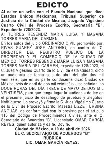 Al margen un sello con el Escudo Nacional que dice: ESTADOS UNIDOS MEXICANOS, TRIBUNAL SUPERIOR DE JUSTICIA DE LA CIUDAD DE MÉXICO, JUZGADO: 45° CIVIL DE PROCESO ESCRITO, EXP. No. 52/2002, SECRETARÍA “B”. En los autos del juicio ORDINARIO CIVIL, seguido por EMILIO FERNANDEZ MADRID, en contra de ROBERTO RIVAS NAVARRETE Y RAUL JARAMILLO JURADO, en el expediente número 52/2002, el C. Juez Cuadragésimo Quinto de lo Civil de Proceso Escrito de la CDMX, dictó el AUTO DE FECHA VEINTISIETE DE MARZO DE DOS MIL VEINTISÉIS que en su parte conducente dice: ...como lo solicita se señalan las DOCE HORAS CON TREINTA MINUTOS DEL DÍA DOCE DE MAYO DEL AÑO EN CURSO. para que tenga verificativo la celebración de la Audiencia de desahogo de pruebas y alegatos; tomando en consideración que de actuaciones se advierte que el tercero llamado a juicio JORGE CÁRDENAS HERNÁNDEZ, fue emplazado por edictos, atento a lo dispuesto por el artículo 639 del Código de Procedimientos Civiles local, hágase del conocimiento del citado tercero la presente audiencia, por medio de edictos que se publicaran POR DOS VECES DE TRES EN TRES DÍAS EN EL PERIÓDICO “DIARIO DE MÉXICO”, debiendo mediar entre cada publicación dos días hábiles, los que se contarán a partir del día siguiente de la última publicación de edictos aquí ordenados... NOTIFÍQUESE.- ASÍ, Lo proveyó y firma el C. Juez Cuadragésimo Quinto de lo Civil de Proceso Escrito de la Ciudad de México, Licenciado ENRIQUE SALGADO SEGURA, ante la C. Secretaria de Acuerdos, Licenciada ELVIA PATRICIA RAMOS SOTO, que autoriza y da fe Doy FE. México, Ciudad de México a 08 de Abril del 2026. LA C. SECRETARIA DE ACUERDOS “B”. LICENCIADA ELVIA PATRICIA RAMOS SOTO. RÚBRICA.