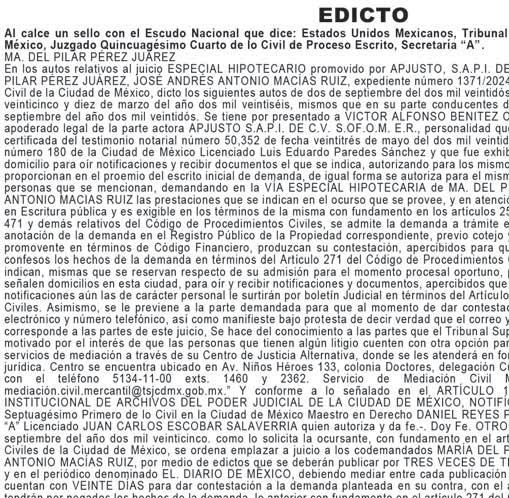 Al margen un sello con el Escudo Nacional que dice: ESTADOS UNIDOS MEXICANOS, TRIBUNAL SUPERIOR DE JUSTICIA DE LA CIUDAD DE MÉXICO, JUZGADO: 67° DE LO CIVIL, EXP. No. 403/2021, SECRETARÍA “A”. En cumplimiento a lo ordenado por auto de fecha VEINTICUATRO DE OCTUBRE Y VEINTICINCO DE SEPTIEMBRE DEL DOS MIL VEINTICINCO, tengo el honor de remitirle el edicto relativo del Juicio ESPECIAL HIPOTECARIO promovido por FACTORAJE AFIRME, S.A. DE C.V., SOCIEDAD FINANCIERA DE OBJETO MÚLTIPLE, ENTIDAD REGULADA, AFIRME GRUPO FINANCIERO en contra de CERON BATISTA ISAAC y MÓNICA GEORGINA SÁNCHEZ SERRA, con número de expediente 403/2021 el C. Juez SEXAGÉSIMO SÉPTIMO de lo Civil de proceso Escrito del Poder Judicial de la Ciudad de México, ordenó emplazar a MÓNICA GEORGINA SÁNCHEZ SERRA mediante EDICTOS que deberán publicarse por tres veces de tres en tres días EN EL BOLETÍN JUDICIAL Y EN EL PERIÓDICO “DIARIO DE MÉXICO” mediando entre cada publicación dos días hábiles hágase saber a la demandada MÓNICA GEORGINA SÁNCHEZ SERRA, que quedan a su disposición en este Juzgado las copias de traslado de la demanda y anexos exhibidos, debidamente sellados, foliados y cotejados por un término de QUINCE DÍAS contados a partir del día siguiente al de la última publicación del edicto, y que cuenta con un plazo de QUINCE DÍAS posteriores al vencimiento del término antes señalado para producir su contestación a la demanda instaurada en su contra, con el apercibimiento que de no hacerlo dentro de dicho término se tendrán por presuntivamente ciertos los hechos de la demanda, atento a lo dispuesto por el artículo 271 del Código de Procedimientos Civiles para el Distrito Federal. En la inteligencia que al momento de contestar la demanda deberán señalar domicilio para oír y recibir notificaciones dentro de esta jurisdicción, apercibidos que en caso de no hacerlo las subsecuentes notificaciones aún las de carácter personal les surtirán por medio de publicación en el Boletín Judicial atento a lo dispuesto por el artículo 112 del Código de Procedimientos Civiles para el Distrito Federal; Asimismo se le hace saber que la demanda entablada en su contra que fue admitida por auto de fecha veintiuno de junio de dos mil veintiuno en el que se tuvo por presentado a LOS CC. LETICIA SALVADOR ROMERO, YADERID ABISAI PICHARDO RAMÍREZ, JUAN CARLOS JAIMES ALMOREJO, promoviendo en su carácter de Apoderados Legales de BANCA AFIRME, SOCIEDAD ANÓNIMA, INSTITUCIÓN DE BANCA MÚLTIPLE, AFIRME GRUPO FINANCIERO, personalidad que acreditan y se les reconoce en términos de las copias certificadas del Instrumento Notarial número cuarenta y ocho mil setecientos sesenta y tres de fecha doce de octubre del año dos mil veinte, en copia certificada. Demandando en la VÍA ESPECIAL HIPOTECARIA en contra de ISAAC CERÓN BAUTISTA, MÓNICA GEORGINA SÁNCHEZ SERRA, las prestaciones que menciona, con fundamento en lo dispuesto por los artículos 468 y 469 del Código de Procedimientos Civiles para el Distrito Federal se admite a trámite la demanda en la vía y forma propuestas con las siguientes prestaciones: a La declaración. Judicial del vencimiento anticipado del contrato de Apertura de Crédito Simple con Garantía Hipotecaria en Primer Lugar y Grado, celebrado con fecha diez de diciembre de dos mil diecinueve y que consta en la Escritura Pública número 10,829, pasada ante la fe del Licenciado Juan Carlos Ortega Reyes, Notario Público número 168 del Estado de México, que se adjunta como Anexo 2. Como consecuencia de la declaratoria de vencimiento anticipado, se reclama el pago del saldo insoluto del adeudo derivado del documento base de la acción, integrándose como sigue: b) El pago de la cantidad de $4,819,120.66 (CUATRO MILLONES OCHOCIENTOS DIECINUEVE MIL CIENTO VEINTE PESOS 66/100 m/n.) por concepto de suerte principal o capital del crédito, el cual se integra de la siguiente manera: I) La cantidad de $4,806,044.74 (CUATRO MILLONES OCHOCIENTOS SEIS MIL CUARENTA Y CUATRO 74/100 M.N.), como capital vencido anticipadamente de conformidad a lo establecido en las Cláusulas Financieras Primera, Décima Sexta del Contrato de Crédito base de la acción; II) La cantidad de $13,075.92 (TRECE MIL SETENTA Y CINCO PESOS 92/100 M.N.), como capital vencido de conformidad a lo establecido en las Cláusulas Financieras Primera y Sexta del Contrato de Crédito base de la acción. c) El pago de la cantidad de $295,361.50 (DOSCIENTOS NOVENTA Y CINCO MIL TRESCIENTOS SESENTA Y UN PESOS 50/100 M.N.) por concepto de Intereses Ordinarios generados del cuatro de diciembre de dos mil veinte, hasta el veinticuatro de mayo de dos mil veintiuno, en términos de la Cláusula Financiera Primera y Quinta del Contrato de Apertura de Crédito Simple con Garantía Hipotecaria en Primer Lugar y Grado, más los que se sigan generando hasta la total solución del adeudo, que serán cuantificados en ejecución de Sentencia. d) El pago de la cantidad de $334.96 (TRESCIENTOS TREINTA Y CUATRO PESOS 96/100 M.N.) por concepto de Intereses Moratorios generados del cinco de marzo de dos mil veintiuno hasta el veinticuatro de mayo de dos mil veintiuno, en términos de la Cláusula Financiera Primera y Quinta del Contrato de Apertura de Crédito Simple con Garantía Hipotecaria en Primer Lugar y Grado, más los que se sigan generando hasta la total solución del adeudo, que serán cuantificados en ejecución de Sentencia. a) El pago de la cantidad de $1,794.00 (MIL SETECIENTOS NOVENTA Y CUATRO PESOS 00/100 M.N.) por concepto de Comisión por Autorización DE Crédito Diferida a partir del cuatro de diciembre de dos mil veinte, al Cuatro de mayo de dos mil veintiuno, establecida en el Contrato de Apertura de Crédito Simple, más las que sigan generando hasta la total solución del adeudo, cuantificables en ejecución de Sentencia. b) El pago de la cantidad de $287.04 (DOSCIENTOS OCHENTA Y SIETE PESOS 04/100 M.N.) por concepto de Impues