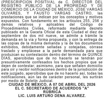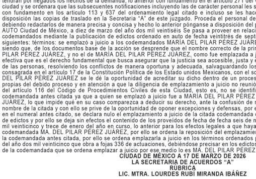 CON LAS COPIAS SIMPLES EXHIBIDAS PARA EL TRASLADO, PROCÉDASE A NOTIFICAR Y EMPLAZAR A LAS PARTES ENJUICIADAS EN EL DOMICILIO QUE SE INDICA EN EL ESCRITO DE CUENTA, PARA QUE EN EL TÉRMINO DE QUINCE DÍAS DEN CONTESTACIÓN A LA DEMANDA INSTAURADA EN SU CONTRA Y HAGAN VALER LAS EXCEPCIONES Y DEFENSAS QUE TUVIERE PARA ELLO, “...”, PREVÉNGASE A LAS PARTES DEMANDADAS PARA QUE SEÑALEN DOMICILIO PARA OÍR Y RECIBIR NOTIFICACIONES DENTRO DE LA JURISDICCIÓN TERRITORIAL DE ESTE H. JUZGADO, O EN SU CASO PROPORCIONEN DIRECCIÓN DE CORREO ELECTRÓNICO A FIN DE RECIBIR NOTIFICACIONES PERSONALES; APERCIBIDOS QUE EN CASO DE NO HACERLO LAS SUBSECUENTES NOTIFICACIONES INCLUSIVE LAS DE CARÁCTER PERSONAL LES SURTIRÁN POR MEDIO DE LA PUBLICACIÓN QUE SE HAGA EN EL BOLETÍN JUDICIAL, ATENTO A LO DISPUESTO POR EL ARTÍCULO 111, 112 Y 113 DEL CÓDIGO DE PROCEDIMIENTOS CIVILES DE LA CIUDAD DE MÉXICO. “…”, CONSTE. DOY FE. CIUDAD DE MÉXICO, 25 DE FEBRERO DE 2026. C. SECRETARIA DE ACUERDOS “A”. LICENCIADA KARLA JACKELINE ÁLVAREZ FIGUEROA. RÚBRICA.