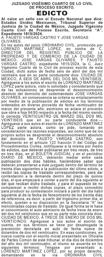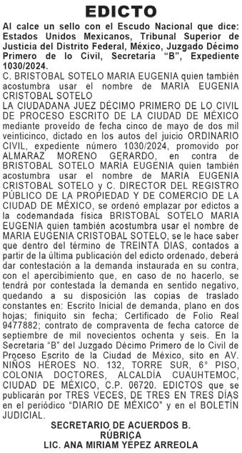 Al margen un sello con el Escudo Nacional que dice: ESTADOS UNIDOS MEXICANOS, TRIBUNAL SUPERIOR DE JUSTICIA DE LA CIUDAD DE MÉXICO, JUZGADO: 38° CIVIL DE PROCESO ESCRITO, EXP. No. 42/2023, SECRETARÍA “B”. SE EMPLAZA A: ALBERTO JUÁREZ JASSO. En los autos del juicio ORDINARIO CIVIL, promovido por GARCÍA GUTIÉRREZ CARLOS, en contra de ALBERTO JUÁREZ JASSO, expediente 42/2023, el C. JUEZ TRIGÉSIMO OCTAVO DE LO CIVIL DE PROCESO ESCRITO DEL PODER JUDICIAL DE LA CIUDAD DE MÉXICO, dictó el siguiente auto que en su parte conducente dice: CIUDAD DE MÉXICO A CUATRO DE MARZO DE DOS MIL VEINTISÉIS. “...” toda vez que de actuaciones se advierte que no se localizó domicilio alguno del demandado ALBERTO JUÁREZ JASSO, “...” procédase a emplazar a juicio al demandado, por medio de edictos que se publicarán por TRES VECES DE TRES EN TRES DÍAS en el BOLETÍN JUDICIAL y en el periódico “DIARIO DE MÉXICO” debiendo mediar entre cada publicación dos días hábiles, haciéndose saber que debe presentarse dentro de un término de TREINTA DÍAS contados a partir del día siguiente al de la última publicación, quedando a su disposición las copias para el traslado correspondientes a la demandada en la Secretaría de Acuerdos “B” del Juzgado. “...” NOTIFÍQUESE. “...” CIUDAD DE MÉXICO A VEINTISÉIS DE ENERO DE DOS MIL VEINTITRÉS. “...”Se tiene por presentado a GARCÍA GUTIERREZ CARLOS por derecho propio, “...” demandando en la VÍA ORDINARIA CIVIL de ALBERTO JUAREZ JASSO, las prestaciones que reclama “...” se admite la demanda en la vía y forma propuesta, “...” para que dentro del término de QUINCE DÍAS la conteste “…” NOTIFÍQUESE. “...”