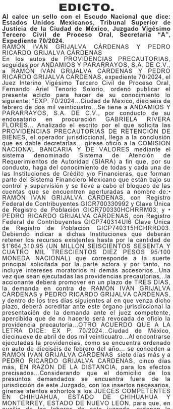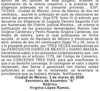 DIARIO DE MÉXICO, diario de información general, es editado por Editorial DDM, S.A. de C.V., con reserva de derechos al uso exclusivo número 04-2001052413165300-101. Certificado de licitud de Título 06788 y Certificado de Licitud de contenido 07299, otorgados por la comisión calificadora de publicaciones y revistas ilustradas de la secretaria de Gobernación. Editor responsable Consuelo Oyuki Zapata Torres. Domicilio de Publicación, Calle Chimalpopoca #38, Colonia Obrera, CP 06800, alcaldía Cuauhtémoc, CDMX. Impreso en Cía. Periodística Esto, S.A. de C.V. con dirección en Guillermo Prieto #7, Colonia San Rafael, CP 06470, Alcaldía Cuauhtémoc, CDMX. Distribuidor del periodico: Distribuidora Dabeli SA de CV (Arredondo e Hijos ) Iturbide 18-D, Colonia Centro Alcaldia Cuauhtemoc, CP 06040, CDMX. Periodicidad de la publicación: Lunes a Viernes.
