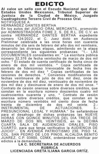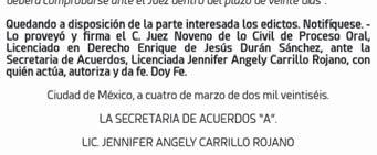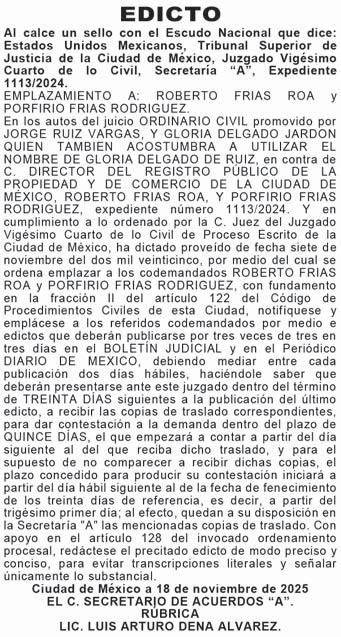 NOTIFICAR Y EMPLAZAR A BLANCA ESTELA DURAN FLORES. En los autos del juicio ORDINARIO CIVIL promovido por CARLOS SALGADO DEALMONTE, en contra de BLANCA ESTELA DURAN FLORES, JUAN ANTONIO LEYTE MARTINEZ, C. DIRECTOR DEL REGISTRO PÚBLICO DE LA PROPIEDAD Y DEL COMERCIO DE LA CIUDAD DE MÉXICO, expediente número 1108/2023, la C. JUEZ CUADRAGÉSIMO CUARTO DE LO CIVIL DE PROCESO ESCRITO DE LA CIUDAD DE MÉXICO, SEIS DE OCTUBRE DE DOS MIL VEINTICINCO.--- Agréguese a su expediente número 1108/2023, el escrito de la parte actora por su propio derecho, a quien se le tiene exhibiendo la cotización de la publicación de los edictos en el periódico DIARIO DE MÉXICO la cual es menos onerosa, que el del DIARIO UNIVERSAL, consecuentemente publíquense los edictos en los términos ordenados en el auto de fecha once de julio del año en curso en el periódico DIARIO DE MÉXICO y no en el UNIVERSAL como lo refiere el citado proveído, por ser menos onerosos de conformidad con lo que dispone el artículo 128 del Código de Procedimientos Civiles para el Distrito Federal hoy Ciudad de México, [...].- Notifíquese.- Lo proveyó y firma electrónicamente el C. Juez Cuadragésimo Cuarto de lo Civil de Proceso Escrito de la Ciudad de México adscrito, Licenciado JAVIER RAYMUNDO VILLALPANDO CASTILLO, ante el Secretario de Acuerdos B, Licenciado SALVADOR COVARRUBIAS TORO, que autoriza y da fe. (S.C.T) otro auto (...) CIUDAD DE MÉXICO A ONCE JULIO DEL AÑO DOS MIL VEINTICINCO.--- [...], por su propio derecho, visto su contenido, y analizadas que fueron las constancias de autos, se advierte la imposibilidad de notificar a la demandada BLANCA ESTELA DURAN FLORES, el proveído de veintisiete de octubre de dos mil veintitrés (foja 15), no obstante de haber solicitado informes a las instituciones y dependencias referidas en la certificación que antecede para efectos de poder localizar domicilio del mismo sin obtener resultados positivos; como lo solicita el ocursante, para efectos de salvaguardar su derecho al debido proceso y respetar el derecho humano de audiencia consagrado en el artículo 14 de la Constitución Política de los Estados Unidos Mexicanos, y con fundamento en el artículo 122, fracción II, del Código de Procedimientos Civiles para el Distrito Federal, hoy Ciudad de México, se ordena notificar y emplazar a BLANCA ESTELA DURAN FLORES, por medio de edictos que se publicarán por TRES VECES DE TRES EN TRES DÍAS, en el Boletín Judicial del Tribunal Superior de Justicia de la Ciudad de México y en el periódico “EL UNIVERSAL”, debiendo mediar entre cada publicación dos días hábiles, haciéndole saber a la demandada que se ha entablado demanda en su contra y que tiene un plazo de VEINTE DÍAS, para dar contestación a la demanda, contados a partir de la última publicación de los edictos ordenados, quedando a su disposición las copias de traslado en la Secretaría de Acuerdos; (...) -Notifíquese.- Lo proveyó y firma electrónicamente la C. Juez Cuadragésimo Cuarto de lo Civil de Proceso Escrito de la Ciudad de México, Licenciada SANDRA LUZ DÍAZ ORTIZ, ante el Secretario de Acuerdos B, Licenciado SALVADOR COVARRUBIAS TORO, que autoriza y da fe. (RJBH). Otro auto (...) CIUDAD DE MÉXICO A VEINTISIETE DE OCTUBRE DEL AÑO DOS MIL VEINTITRÉS. […] se tiene por desahogada en tiempo la prevención ordenada por auto del dieciocho de octubre del año en curso, por lo que se procede a proveer de la siguiente manera: Se tiene por presentado a SALGADO DEALMONTE CARLOS, por su propio derecho; por señalado el domicilio que indica, señalando los medios de comunicación para llevar a cabo las notificaciones personales en el presente juicio, en cumplimiento a la Circular CJCDMX-18/2020 emitida en cumplimiento a lo ordenado en Acuerdo 05-19/2020, emitido por el Pleno del Consejo de la Judicatura de la Ciudad de México, en sesión extraordinaria celebrada el nueve de junio del año dos mil veinte, respecto a la reanudación de las actividades en las Salas y Juzgados Civiles y Familiares del Poder Judicial de la Ciudad de México, así como lo estipulado en el artículo 111 fracción VII del Código de Procedimiento Civiles. Por autorizadas a las personas que menciona para los fines que precisa; y tocante a las autorizaciones que otorga en términos del cuarto párrafo del artículo 112 del Código de Procedimientos Civiles, los profesionistas que menciona deberán dar cumplimiento con lo que establece el precepto citado, debiendo exhibir para ello copia de la constancia de registro de cédula profesional ante la Primera Secretaria de Presidencia del Tribunal Superior de Justicia de esta Ciudad, apercibidos que de no hacerlo únicamente se les tendrá por autorizados para oír y recibir notificaciones; Se les tiene demandando en la vía ORDINARIA CIVIL de: 1. BLANCA ESTELA DURAN FLORES 2. JUAN ANTONIO LEYTE MARTÍNEZ 3. C. DIRECTOR DEL GENERAL REGISTRO PUBLICO DE LA PROPIEDAD Y DEL COMERCIO DE LA CIUDAD DE MÉXICO Las prestaciones que indica, demanda ésta que se admite a trámite con fundamento en los artículos 255, 256, 258, 259 y demás relativos del Código de Procedimientos Civiles, en la vía y forma propuesta y con las copias simples exhibidas para el traslado, notifíquese y emplácese a juicio a la parte demandada, para que dentro del término de QUINCE DÍAS produzcan su contestación, apercibidos en términos de los artículos 272-A y 272-C y demás aplicables del ordenamiento procesal citado, para que en el caso de no contestar la demanda en el término que se les indica, se tendrán por presuntivamente ciertos los hechos de la misma. Se previene a la parte demandada para que señalen domicilio para oír y recibir notificaciones dentro de esta jurisdicción, apercibidos que de no hacerlo, las subsecuentes notificaciones le surtirán efectos por medio del boletín judicial, con fundamento en el artículo 637 del Código de Procedimientos Civiles antes citado o en su caso señalen los