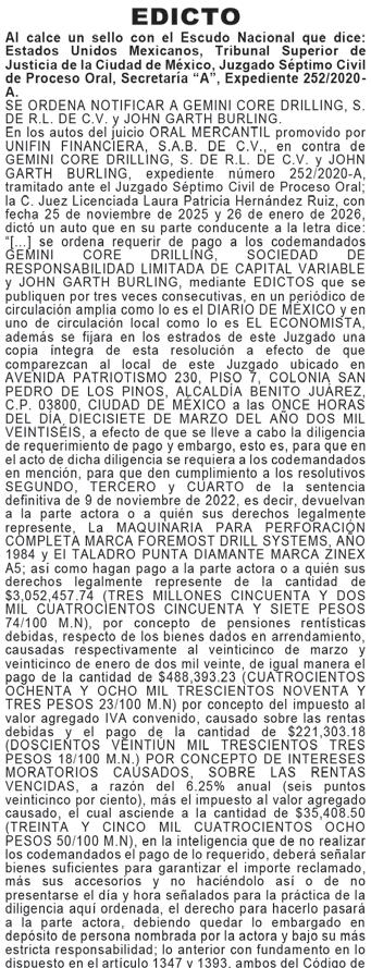 Al margen un sello con el Escudo Nacional que dice: ESTADOS UNIDOS MEXICANOS, TRIBUNAL SUPERIOR DE JUSTICIA DE LA CIUDAD DE MÉXICO, JUZGADO: 19° CIVIL DE PROCESO ORAL, EXP. No. 162/2024. En los autos del juicio EJECUTIVO MERCANTIL ORAL, promovido por HSBC MÉXICO, SOCIEDAD ANÓNIMA, INSTITUCIÓN DE BANCA MÚLTIPLE, GRUPO FINANCIERO HSBC en contra de DELHY MARLEN MENDIOLA AYALA, expediente número 162/2024, el C. Juez Décimo Noveno Civil de Proceso Oral, mediante sentencia definitiva de fecha veintitrés de enero de dos mil veintiséis, ordeno la publicación de los puntos resolutivos por una sola ocasión en los periódicos EL HERALDO DE MÉXICO y EL DIARIO DE MÉXICO, mismos que para tal efecto se transcriben: ---(...) Ciudad de México a veintitrés de enero de dos mil veintiséis. VISTOS para dictar SENTENCIA DEFINITIVA, en los autos del juicio EJECUTIVO MERCANTIL ORAL, promovido por HSBC MÉXICO, S.A. INSTITUCIÓN DE BANCA MÚLTIPLE, GRUPO FINANCIERO HSBC MÉXICO, en contra CALL&RISK S.A. DE C.V. Y MENDIOLA AYALA DELHY MARLEN, expediente número 162/2024, y RESULTANDO: “...RESUELVE: PRIMERO. Ha sido procedente la Vía Ejecutiva Mercantil Oral, en la que la parte actora HSBC MÉXICO, S.A. INSTITUCIÓN DE BANCA MÚLTIPLE, GRUPO FINANCIERO HSBC MÉXICO acreditó los elementos de su acción, y las demandadas CALL&RISK S.A., DE C.V. Y MENDIOLA AYALA DELHY MARLEN, se condujeron en rebeldía; en consecuencia: ---SEGUNDO. Se condenar a las enjuiciadas CALL&RISK S.A. DE C.V. Y MENDIOLA AYALA DELHY MARLEN, a pagar a la actora HSBC MÉXICO, S.A. INSTITUCIÓN DE BANCA MÚLTIPLE, GRUPO FINANCIERO HSBC MÉXICO, la cantidad de $995,225.26 (NOVECIENTOS NOVENTA Y CINCO MIL DOSCIENTOS VEINTICINCO PESOS 26/100, M.N.) por concepto de capital vencido al veintinueve de diciembre de dos mil veintitrés, lo que deberán hacer en el término ce CINCO DÍAS contados a partir de que cause ejecutoria la presente resolución, apercibidas que de no hacerlo se ordenará que los recursos que se encuentran en las cuentas bancarias embargadas sean remitidos a este Juzgado a favor de la parte actora con lo que se hará pago de lo sentenciado, en atención a lo establecido en el considerando IV.--- TERCERO.- Se condenar a las enjuiciadas CALL&RISK S.A. DE C.V. Y MENDIOLA AYALA DELHY MARLEN, a pagar a la actora HSBC MÉXICO, S.A. INSTITUCIÓN DE BANCA MÚLTIPLE, GRUPO FINANCIERO HSBC MÉXICO, al pago de los intereses ordinarios respecto de la suerte principal a una tasa anual a 14.49%, generados a partir del tres de noviembre de dos mil veintitrés hasta el pago total del adeudo, mismos que se cuantificarán y liquidarán en ejecución de sentencia a través del incidente respectivo, en términos de lo que establece el artículo 1348 del Código de Comercio, atento a lo vertido en el considerando IV de la presente resolución.--- CUARTO.- Se condena a las enjuiciadas CALL&RISK S.A. DE C.V. Y MENDIOLA AYALA DELHY MARLEN, a pagar a la actora HSBC MÉXICO, S.A. INSTITUCIÓN DE BANCA MÚLTIPLE, GRUPO FINANCIERO HSBC MÉXICO al pago de los intereses moratorios sobre saldos insolutos respecto de la suerte principal a una tasa anual al 14.49% desde el tres de noviembre de dos mil veintitrés, hasta su total pago de la suerte principal, lo que deberá ser cuantificado en ejecución de sentencia, en términos de lo que establece el artículo 1348 del Código de Comercio, atento a lo esgrimido en el considerado IV de la presente resolución.--QUINTO.- No se hace especial condena en costas.--- SEXTO.- Toda vez que las demandadas fueron emplazadas por edictos, publíquense los puntos resolutivos de la presente resolución por una sola ocasión en los periódicos EL HERALDO DE MÉXICO y EL DIARIO DE MÉXICO. SÉPTIMO.- NOTIFÍQUESE, debiendo quedar constancia en los registros electrónicos que se lleven en este Juzgado.--- ASÍ, DEFINITIVAMENTE JUZGANDO LO RESOLVIÓ Y FIRMA El C. JUEZ DÉCIMO NOVENO CIVIL DE PROCESO ORAL, LICENCIADO TONATIUH MAURICIO FLORES MALDONADO, ANTE SU C. SECRETARIO DE ACUERDOS LICENCIADO MARCO ANTONIO SOSA MUNIVE, CON QUIÉN ACTÚA Y DA FE.- DOY FE.--- Otro auto, que en lo conducente dice: (…) CIUDAD DE MÉXICO, A VEINTINUEVE DE ENERO DEL AÑO DOS MIL VEINTISEIS. Dada nueva cuenta y visto el estado que guardan las presentes actuaciones y toda vez que al dictar la sentencia definitiva de veintitrés de enero de dos mil veintiséis, en la parte conducente de los considerados y resolutivos se señaló como parte demandada a CALL&RISK S.A. DE C.V. Y MENDIOLA AYALA DELHY MARLEN siendo lo correcto parte demandada “MENDIOLA AYALA DELHY MARLEN”, toda vez que en proveído de siete de julio del año dos mil veinticinco se tuvo a la actora por desistida de la acción intentada en contra de CALL&RISK S.A. DE C.V. Lo anterior atendiendo al principio de congruencia que debe prevalecer en todo procedimiento, con fundamento en lo previsto por el artículo 1390 Bis Cuarto Párrafo del Código de Comercio, se tiene aclarado lo anterior, al considerar que, con ello, no se varía su esencia ni se alteran sus consideraciones nodales, lo que por obviedad pasa a formar parte integral del citado auto, para todos los efectos legales a que haya lugar. (…) NOTIFÍQUESE (…) DOY FE.
