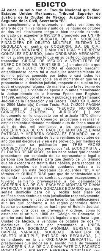 DIARIO DE MÉXICO, diario de información general, es editado por Editorial DDM, S.A. de C.V., con reserva de derechos al uso exclusivo número 04-2001052413165300-101. Certificado de licitud de Título 06788 y Certificado de Licitud de contenido 07299, otorgados por la comisión calificadora de publicaciones y revistas ilustradas de la secretaria de Gobernación. Editor responsable Consuelo Oyuki Zapata Torres. Domicilio de Publicación, Calle Chimalpopoca #38, Colonia Obrera, CP 06800, alcaldía Cuauhtémoc, CDMX. Impreso en Cía. Periodística Esto, S.A. de C.V. con dirección en Guillermo Prieto #7, Colonia San Rafael, CP 06470, Alcaldía Cuauhtémoc, CDMX. Distribuidor del periodico: Distribuidora Dabeli SA de CV (Arredondo e Hijos ) Iturbide 18-D, Colonia Centro Alcaldia Cuauhtemoc, CP 06040, CDMX. Periodicidad de la publicación: Lunes a Viernes.