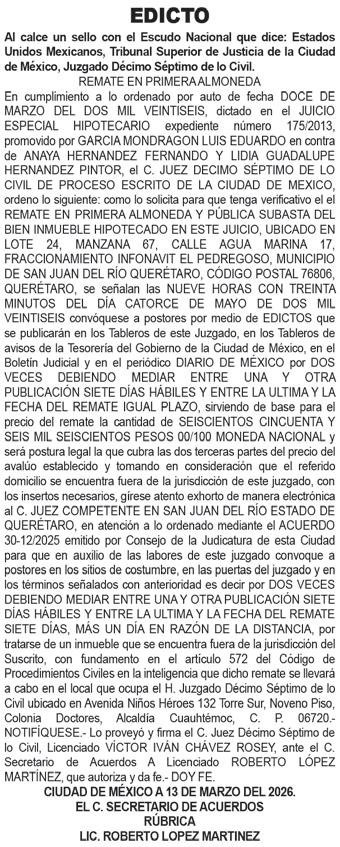 DIARIO DE MÉXICO, diario de información general, es editado por Editorial DDM, S.A. de C.V., con reserva de derechos al uso exclusivo número 04-2001052413165300-101. Certificado de licitud de Título 06788 y Certificado de Licitud de contenido 07299, otorgados por la comisión calificadora de publicaciones y revistas ilustradas de la secretaria de Gobernación. Editor responsable Consuelo Oyuki Zapata Torres. Domicilio de Publicación, Calle Chimalpopoca #38, Colonia Obrera, CP 06800, alcaldía Cuauhtémoc, CDMX. Impreso en Cía. Periodística Esto, S.A. de C.V. con dirección en Guillermo Prieto #7, Colonia San Rafael, CP 06470, Alcaldía Cuauhtémoc, CDMX. Distribuidor del periodico: Distribuidora Dabeli SA de CV (Arredondo e Hijos ) Iturbide 18-D, Colonia Centro Alcaldia Cuauhtemoc, CP 06040, CDMX. Periodicidad de la publicación: Lunes a Viernes.