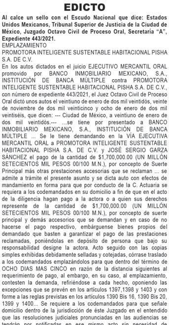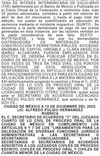 En cumplimiento a lo ordenado en proveído de fecha once de diciembre del año en curso, dictado en los autos del juicio o ORAL MERCANTIL, promovido por PIFESA INTERNACIONAL, S.A. DE C.V., en contra de RODRIGO GARCÍA MARTÍNEZ, expediente 188/2013, el C. Juez Décimo Cuarto en Materia Civil de Proceso Oral y de Tutela de Derechos Humanos de la Ciudad de México, con fundamento en los artículos 1070 1390 Ter 3, 1392, 1393 y 1395 del Código de Comercio, ordenó REQUERIR DE PAGO mediante EDICTOS al demandado RODRIGO GARCÍA MARTÍNEZ, para que comparezca de manera personal, para que se lleve a cabo la diligencia de requerimiento de pago y/o embargo a las DIEZ HORAS CON TREINTA MINUTOS DEL DÍA VEINTISIETE DE ENERO DE DOS MIL VEINTISÉIS, en el local del JUZGADO DÉCIMO CUARTO CIVIL DE PROCESO ORAL Y DE TUTELA DE DERECHOS HUMANOS DEL PODER JUDICIAL DE LA CIUDAD DE MÉXICO, ubicado en el Piso 8, de la Avenida Patriotismo número 230 Colonia San Pedro de los Pinos, Alcaldía Benito Juárez, Ciudad de México. C.P. 03800. 1. Se le requerirá a fin de que haga pago a la actora de la cantidad de El pago de $255,112.98 (DOSCIENTOS CINCUENTA Y CINCO MIL CIENTO DOCE PESOS 98/100 M.N.). Que resulta de sumar las cantidades a que fue condenado el demandado por concepto de suerte principal e intereses legales en la sentencia definitiva de fecha veinticinco de septiembre del año dos mil trece, en la sentencia interlocutoria de fecha siete de mayo del año dos mil catorce, sentencia interlocutoria de fecha dieciocho de septiembre del año dos mil dieciocho y sentencia interlocutoria de fecha treinta de noviembre del año dos mil veintiuno. 2. Deberá señalar bienes de su propiedad suficientes a garantizar la cantidad reclamada como suerte principal, sobre los cuales se trabará embargo; apercibida que en caso de no hacerlo o que esté ausente; la actora señalará bienes para embargo, quien bajo su más estricta responsabilidad señalará bienes sobre los cuales el C. Actuario de la adscripción trabará formal embargo.
