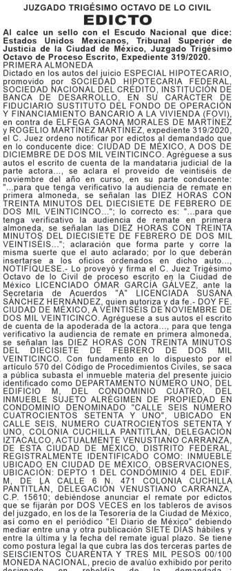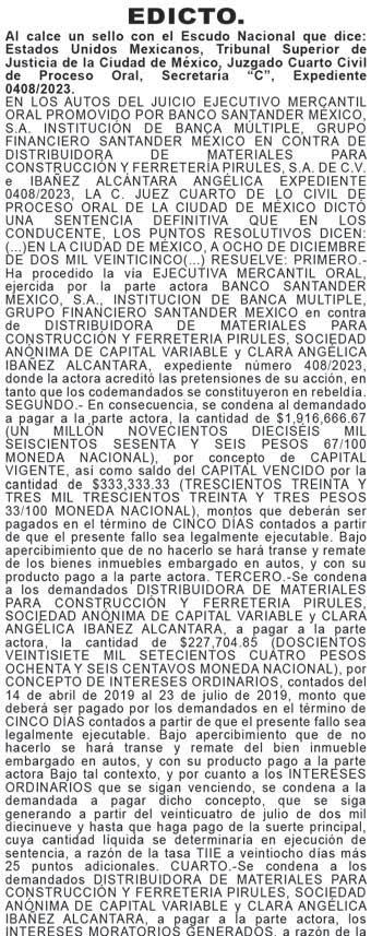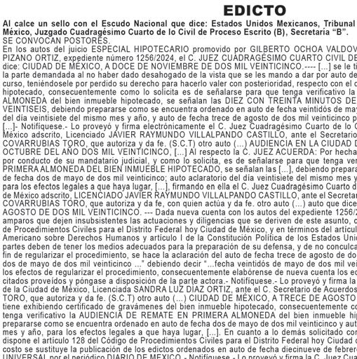 En cumplimiento a lo ordenado en proveído de nueve de enero de dos mil veintiséis, dictado en los autos del JUICIO EJECUTIVO MERCANTIL ORAL, promovido por CEMENTOS MOCTEZUMA SOCIEDAD ANÓNIMA DE CAPITAL VARIABLE en contra de CONSTRUCTORA EGUL, SOCIEDAD ANÓNIMA DE CAPITAL VARIABLE Y FERNANDO DAVID ESPINOSA MORENO; relativo al expediente 352/2023; se ordenó que la diligencia señalada en auto de once de julio de dos mil veintitrés se realice por medio de edictos, señalando como fecha para la diligencia de requerimiento de pago de $1,090,000.00 (UN MILLÓN NOVENTA MIL PESOS 00/100 MONEDA NACIONAL) y, en su caso, embargo las ONCE HORAS DEL DÍA TREINTA DE ENERO DE DOS MIL VEINTISÉIS, en el LOCAL DE ESTE JUZGADO, para tal efecto deberán publicarse los edictos en los periódicos “EL UNIVERSAL” y “DIARIO DE MÉXICO”, así como, en los estrados del juzgado, por tres veces consecutivas, haciéndole saber al demandado que tiene el termino de TREINTA DÍAS contados a partir del día siguiente al de la última publicación para producir su contestación a la demanda, con el apercibimiento que de no hacerlo, se tendrá por precluido su derecho para hacerlo con posterioridad y se seguirá el juicio en su rebeldía, quedando a su disposición en la Secretaría “A” de este juzgado las copias simples de traslado de la demanda, para los efectos legales que haya lugar.