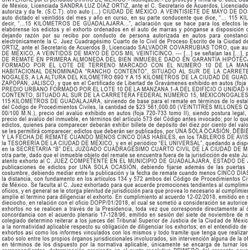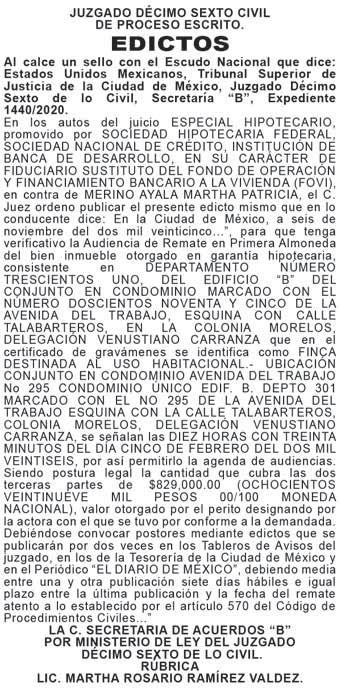 En los autos del juicio ESPECIAL HIPOTECARIO, promovido por BANCO MERCANTIL DEL NORTE, S.A., INSTITUCIÓN DE BANCA MÚLTIPLE, GRUPO FINANCIERO BANORTE, en contra de GRACIANO Y ASOCIADOS, S.A. DE C.V., y MARÍA ELENA GRACIANO CUEVAS, expediente número 1126/2007, Secretaría “B” la C. Juez dictó un proveído que en lo conducente dice: Ciudad de México a treinta de octubre del año dos mil veinticinco “(...)” se ordena sacar a Pública Subasta respecto del bien inmueble hipotecado consistente en el ubicado en: Lote 118 Manzana 07 Tipo de Colonia Fraccionamiento Residencial Quintas Lerdo de la Ciudad de Lerdo, Durango (Cerrada Los Escultores), con la superficie, medidas y linderos descritos en la Escritura Pública base de la acción, y para que tenga verificativo la diligencia de REMATE EN PRIMERA ALMONEDA se señalan las ONCE HORAS DEL DÍA DIECISIETE DE FEBRERO DEL AÑO DOS MIL VEINTISÉIS, debiéndose convocar postores por medio de edictos que se publicarán en los Tableros de Avisos del Juzgado, en los de la Secretaría de Administración y Finanzas de esta Ciudad de México y el Periódico el Diario de México, por dos veces, debiendo mediar entre una y otra publicación siete días hábiles y entre la última y la fecha del remate, igual plazo, sirviendo de base para el remate la cantidad de $993,000.00 (NOVECIENTOS NOVENTA Y TRES MIL PESOS 00/100 MONEDA NACIONAL), que resulto del avalúo rendido por el perito designado por la parte actora, siendo postura legal la que cubra las dos terceras partes de dicha cantidad y para intervenir en la subasta, los licitadores deberán consignar previamente a este Juzgado, mediante billete de depósito correspondiente expedido por el Banco del Ahorro Nacional y Servicios Financieros ahora Banco del Bienestar, Sociedad Nacional de Crédito, Institución de Banca de Desarrollo, por una cantidad igual al diez por ciento del valor del bien que sirve de base para el remate, sin cuyo requisito no serán admitidos, “(...)” y toda vez que el inmueble se encuentra fuera de la jurisdicción de este Juzgado, gírese atento exhorto con los anexos necesarios al C. Juez Competente del MUNICIPIO DE LERDO, ESTADO DE DURANGO, para que en auxilio de las labores de este Juzgado se sirva publicar por dos veces, los edictos en los lugares que marca la legislación de aquella entidad y en los lugares de costumbre de dicha entidad, debiendo mediar entre una y otra publicación siete días hábiles más cinco días hábiles en razón de la distancia, y entre la última y la fecha de remate igual plazo, “(...)” Notifíquese.- Así lo proveyó y firman electrónicamente la C. Jueza Cuadragésimo Primero de lo Civil de Proceso Escrito de la Ciudad de México, Maestra ANA MERCEDES