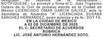 En cumplimiento a lo ordenado en auto de veintinueve de agosto y cuatro de septiembre de dos mil veinticinco dictado en el juicio ESPECIAL MERCANTIL, expediente 2336/2024, promovido por ALFREDO HERNANDEZ MENENDEZ SU SUCESIÓN en contra de GRUPO DESARROLLADOR FUSION SOCIEDAD ANONIMA DE CAPITAL VARIABLE, el Juez Sexto Civil y de Extinción de Dominio de la Ciudad de México, dicto un acuerdo que a la letra dice: CIUDAD DE MÉXICO A TRES DE MAYO DE DOS MIL VEINTITRÉS. ...Con fundamento en los artículos 340, 341, 342 de la Ley General de Títulos y Operaciones de Crédito, en relación con los artículos 1049, 1055, 1092, 1094 y demás relativos y aplicables del Código de Comercio, se admite su demanda en la vía ESPECIAL MERCANTIL (VENTA DE PRENDA CON POSESIÓN DE TÍTULOS), en contra de GRUPO DESARROLLADOR FUSIÓN, SOCIEDAD ANÓNIMA DE CAPITAL VARIABLE, de quien se reclaman las prestaciones que se mencionan en su demanda; en consecuencia, con las copias simples exhibidas, debidamente foliadas, selladas y cotejadas, se deberá correr traslado y EMPLAZAR a la parte demandada para que dentro del término de QUINCE DÍAS produzca su contestación a la demanda y oponga las defensas y excepciones que le asistan a efecto de demostrar la improcedencia de la misma, y hecho o no lo anterior, se procederá conforme lo dispone el artículo 341 del Ley General de Títulos y Operaciones de Crédito. Por otro lado, se previene a la parte demandada para que señale domicilio en esta Ciudad para oír y recibir notificaciones, con el apercibimiento que de no hacerlo, se le declarará en rebeldía y las subsecuentes notificaciones le surtirán en términos de lo dispuesto por el artículo 1069 párrafo segundo del Código en cita. De conformidad con el Acuerdo V-11/2022 de fecha cuatro de marzo de dos mil veintidós, emitido por el Pleno del Consejo de la Judicatura de la Ciudad de México, mediante el cual establece seguir privilegiando el uso de medios electrónicos y plataformas virtuales en las actividades que así lo permitan, tanto para comunicación interinstitucional, como con el público en general; se conmina a ambas partes para que la parte actora dentro del término de TRES DÍAS y la parte demandada dentro del término concedido para contestar la demanda proporcionen correo electrónico, número telefónico o cualquier otro medio de comunicación electrónico para efecto de oír y recibir notificaciones con independencia del domicilio físico que se señale para tal efecto, en el entendido que dicha notificación electrónica surtirá sus efectos conforme lo dispuesto por el artículo 321 del Código Federal de Procedimientos Civiles de aplicación supletoria a la materia mercantil. Lo anterior, con el solo fin, de privilegiar el uso de la notificación electrónica para agilizar la impartición de justicia; en el entendido, de no proporcionar medio de comunicación electrónica alguna, las notificaciones personales, se realizarán en el domicilio procesal que se señale para tal efecto... CIUDAD DE MÉXICO, A VEINTINUEVE DE AGOSTO DE DOS MIL VEINTICINCO. ...en consecuencia y con fundamento en lo dispuesto por el artículo 1070 del Código de Comercio y 315 del Código federal de Procedimientos Civiles de aplicación supletoria a la materia mercantil, se ordena que el emplazamiento de la demandada antes aludida, ordenado en proveído de TRES DE MAYO DE DOS MIL VEINTITRÉS, se realice por medio de EDICTOS, mismos que deberán publicarse por tres veces, de siete en siete días en los periódicos denominados “EL DIARIO DE MÉXICO” y “DIARIO IMAGEN”, debiendo además fijarse en los estrados de este Juzgado, las cédulas de notificación correspondientes en las que se contenga copia íntegra del auto admisorio así como del presente proveído por todo el tiempo del emplazamiento, haciéndoles saber a la demandada GRUPO DESARROLLADOR FUSIÓN, S.A. DE C.V., que debe presentarse al local de este Juzgado dentro del término de TREINTA DÍAS, contados a partir del día siguiente de la última publicación que se realice de los edictos antes mencionados, a efecto de que reciba las copias simples de traslado de la demanda instaurada en su contra y esté en aptitud de contestar la misma dentro del término de QUINCE DÍAS a que referencia el auto de admisorio de TRES DE MAYO DE DOS MIL VEINTITRÉS, quedando en la Secretaría respectiva a partir de la citada fecha, las copias simples de traslado señaladas, para los efectos precisados; previniéndose a la multicitada demandada, que si pasado el término antes mencionado, no comparece por conducto de apoderado legal o por gestor, que pueda representarla, se seguirá el juicio en su rebeldía haciéndoseles las ulteriores notificaciones por BOLETÍN JUDICIAL, lo anterior con fundamento en el artículo 1069 del Código de Comercio... CIUDAD DE MÉXICO, A CUATRO DE SEPTIEMBRE DE DOS MIL VEINTICINCO. …Visto el contenido del auto de VEINTINUEVE DE AGOSTO DE DOS MIL VEINTICINCO del que se desprende que por error involuntario se ordenó publicar los edictos por tres veces de siete en siete días a efecto de emplazar a la parte demandada, siendo lo correcto por tres veces consecutivas como lo ordena el artículo 1070 del Código de Comercio; en tal virtud, se hace la presente aclaración en relación a las publicaciones de edictos para quedar en la forma señalada en último término; precisión que se realiza para los efectos legales a que haya lugar, formando parte integral el presente proveído del auto antes señalado, no debiendo expedir copia simple o certificada de la misma sin la debida inserción de este proveído… ATENTAMENTE