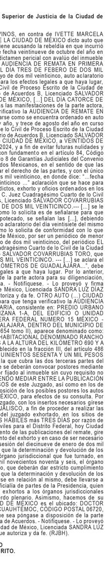 Que en los autos del cuaderno de amparo directo 549/2025, promovido por Cristian Zarabozo Enríquez de Rivera, por propio derecho, en contra de la sentencia de quince de agosto de dos mil veinticinco, dictada por la Quinta Sala Civil del Tribunal Superior de Justicia de la Ciudad de México, en los autos de los tocas 256/2022/5, 256/2022/6, 256/2022/7, 256/2022/8 y 256/2022/9; así como los actos de ejecución atribuidos al Juez Quincuagésimo Octavo Civil de la Ciudad de México, se ordenó emplazar a usted por conducto de quien legalmente la representa, por medio de edictos, por virtud de ignorarse su domicilio y en su carácter de tercero interesado la interposición del juicio de amparo directo ante el Décimo Primer Tribunal Colegiado en Materia Civil del Primer Circuito, a fin de que acuda ante la citada autoridad federal dentro de un plazo de treinta días contados a partir del día siguiente a la última publicación, una vez hecho lo anterior o transcurrido ese plazo, contará con el término de quince días para formular alegatos o presentar amparo adhesivo, ante este tribunal colegiado, lo anterior con fundamento en los artículos 315 del Código Federal de Procedimientos Civiles y 181 de la Ley de Amparo.