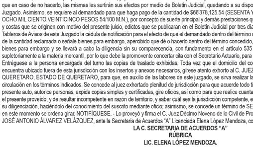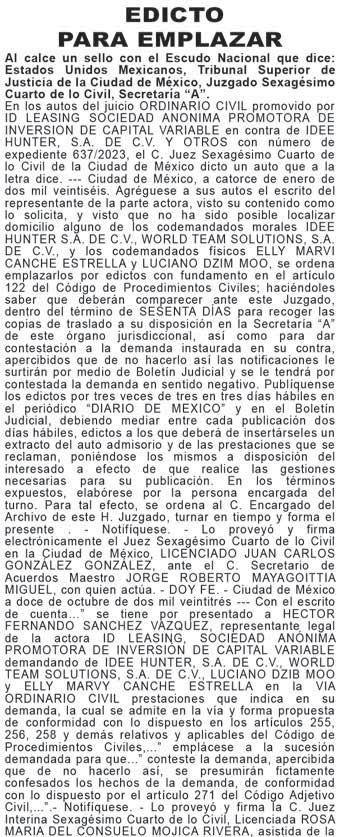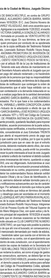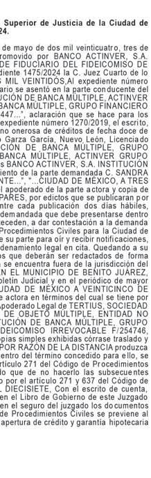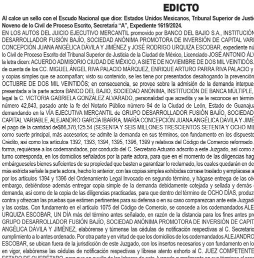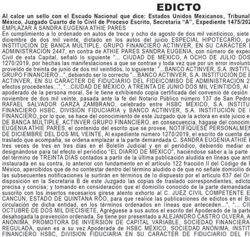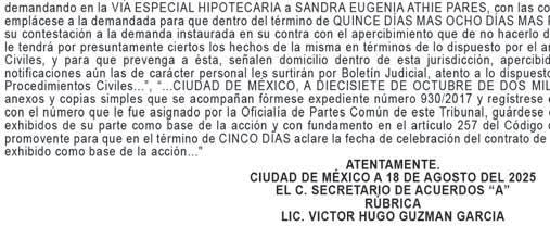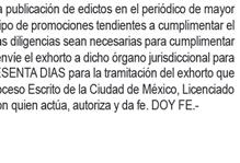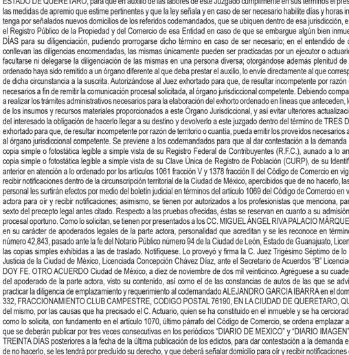 En los autos del juicio EJECUTIVO MERCANTIL, promovido por RAMIREZ ASCENCIO JESUS en contra de ARIZMENDI ALFARO ALBINO JAVIER y CAMPOS TELLES DULCE MARIA (quién también utiliza el nombre DULCE MARIA NORA CAMPOS TELLEZ), expediente número 443/2024, el C. Juez Décimo Noveno Civil de Proceso Oral, dictó unos autos que a la letra dicen: --- “...CIUDAD DE MÉXICO, A VEINTISIETE DE NOVIEMBRE DEL AÑO DOS MIL VEINTICINCO. A sus autos el escrito presentado por el endosatario en procuración de la parte actora, visto su contenido y toda vez que al dictar el auto de catorce de noviembre del presente año, en su parte conducente se señaló: “...Asimismo, se FACULTA al Juez exhortado para que en el caso de que el exhorto haya sido remitido a órgano diferente al que deba prestar el auxilio, éste lo envíe directamente al que corresponda de conformidad con los párrafos séptimo y octavo del artículo 1072 del Código de Comercio...” Atendiendo al principio de congruencia que debe prevalecer en todo procedimiento, con fundamento en lo previsto por el artículo 1390 Bis Cuarto Párrafo del Código de Comercio, aclarado que dicho párrafo queda sin efectos, lo anterior, al considerar que no se varía su esencia ni se alteran sus consideraciones nodales, lo que por obviedad pasa a formar parte integral del citado auto, para todos los efectos legales a que haya lugar. NOTIFÍQUESE. Lo proveyó y firma el C. JUEZ DECIMO NOVENO CIVIL DE PROCESO ORAL DE LA CIUDAD DE MEXICO, LICENCIADO TONATIUH MAURICIO FLORES MALDONADO, quien actúa asistido del C. SECRETARIO DE ACUERDOS “C” LICENCIADO ADOLFO LOPEZ CUENCA quien autoriza y da fe. DOY FE.--- “...CIUDAD DE MÉXICO, A CATORCE DE NOVIEMBRE DEL AÑO DOS MIL VEINTICINCO. A sus autos el escrito presentado por el endosatario en procuración de la parte actora, visto su contenido y considerando que en diligencia de veintinueve de octubre de dos mil veinticinco, se llevó a cabo con fuerzo pública, y que existe oposición de la demandada para el emplazamiento. En consecuencia, no ha lugar a proveer de conformidad el rompimiento de cerraduras, toda vez de que la naturaleza del juicio que se trata no contempla el rompimiento de cerraduras, y el artículo 432 del Código Federal de Procedimientos Civiles, no es aplicable de forma supletoria, ya que en el presente juicio se siguen las reglas contenidas en el artículo 1070 párrafo séptimo del Código de Comercio. Al estar acreditado que la fedataria se ha cerciorado de que en el domicilio sí habita la persona buscada y después de la habilitación de días horas y inhábiles, persistir la negativa de abrir o de atender la diligencia. Lo procedente es ordenar el emplazamiento al codemandado POR MEDIO DE EDICTOS, que contendrán una relación sucinta de la demanda, y se publicarán por TRES VECES CONSECUTIVAS en el periódico “HERALDO DE MEXICO” Y “DIARIO DE MÉXICO” de siete en siete días, para que comparezca al local de este juzgado dentro del término de treinta días, contados del siguiente al de la última publicación, a recibir las copias de traslado. Se fijará, además, en la puerta del juzgado, una copia íntegra de la resolución, por todo el tiempo del emplazamiento. Asimismo, se FACULTA al Juez exhortado para que en el caso de que el exhorto haya sido remitido a órgano diferente al que deba prestar el auxilio, éste lo envíe directamente al que corresponda de conformidad con los párrafos séptimo y octavo del artículo 1072 del Código de Comercio. Elabórese el correspondiente edicto para ser puesto a disposición de la accionante para su pronta diligenciación. NOTIFÍQUESE. Lo proveyó y firma el C. JUEZ DECIMO NOVENO CIVIL DE PROCESO ORAL DE LA CIUDAD DE MÉXICO, LICENCIADO TONATIUH MAURICIO FLORES MALDONADO quien actúa asistido del C. SECRETARIO DE ACUERDOS “C” LICENCIADO ADOLFO LOPEZ CUENCA quien autoriza y da fe...”. DOY FE.--- “...CIUDAD DE MÉXICO, A OCHO DE AGOSTO DE DOS MIL VEINTICUATRO. Se tiene por presentado a RICARDO MISAEL JIMÉNEZ RODRÍGUEZ, en su carácter de endosatario en procuración de RAMIREZ ASCENCIO JESÚS, personalidad que acredita y se le reconoce en términos del endoso que obra adherido al pagaré mencionado, demandando en la VÍA EJECUTIVA MERCANTIL de ARIZMENDI ALFARO ALBINO JAVIER y CAMPOS TÉLLES DULCE MARÍA (quien también utiliza el nombre DULCE MARÍA NORA CAMPOS TÉLLEZ), las prestaciones que se indican en el ocurso de cuenta; misma que se admite a trámite con fundamento en los artículos 1055, 1055 bis, 1391, del Código de Comercio y 170 de la Ley General de Títulos y Operaciones de Crédito, así como con base al acuerdo general 45-17/2024 de fecha doce de junio de dos mil veinticuatro emitido por La Secretaría General De Consejo De La Judicatura De La Ciudad De México, publicado en el Boletín Judicial el día trece de junio de dos mil veinticuatro, se admite a trámite en la vía y forma propuestas. En tal virtud, elabórese la cédula de notificación y constitúyase la C. ACTUARIA que corresponda en el domicilio de los codemandados especificado en el escrito inicial de demanda, a fin de que le requiera a los codemandados el pago de la cantidad de $50,000.00 CINCUENTA MIL PESOS 00/100 M.N.) por concepto de suerte principal, más los accesorios reclamados y no haciéndolo en el acto de la diligencia señalen bienes de su propiedad suficientes a garantizar lo reclamado, apercibidos que de no realizalo, el derecho pasara a la parte actora, poniéndolos en depósito de la persona que bajo su más estricta responsabilidad designe la actora al momento de la diligencia y realizado que sea lo anterior, con las copias simples que se exhiben emplácense y córraseles traslado para que en el término de OCHO DÍAS contesten la demanda o comparezcan al local de éste órgano jurisdiccional a hacer pago llano de lo reclamado o se opongan a la ejecución si tuviere alguna excepción para ello. Y toda vez que no señaló domicilio de 