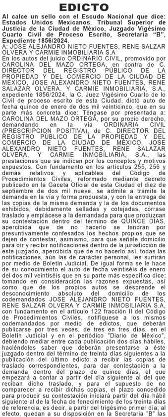 En cumplimiento a lo ordenado por auto de fecha dos de diciembre del año dos mil veinticinco, dictado en los autos del juicio ORDINARIO CIVIL promovido por JANETT ÁLVAREZ LÓPEZ también conocida como JANET ÁLVAREZ LÓPEZ O YANET ÁLVAREZ LÓPEZ en contra de CARMEN DE MARÍA Y CAMPOS GARCÍA TAMBIÉN CONOCIDA COMO CARMEN DE MARÍA Y CAMPOS DE GARCÍA O COMO CARMEN DE MARÍA CAMPOS Y GARCÍA DE GUTIÉRREZ O COMO CARMEN DE MARÍA Y CAMPOS DE GUTIÉRREZ O COMO MARIA DEL CARMEN DE MARÍA Y CAMPOS GARCÍA DE G. O COMO CARMEN CAMPOS GARCÍA O COMO CARMEN DE MARÍA Y CAMPOS SU SUCESIÓN por conducto de su Albacea Y REGISTRO PÚBLICO DE LA PROPIEDAD Y DEL COMERCIO DE LA CIUDAD DE MÉXICO expediente 1017/2024, el C. Juez Décimo de lo Civil dictó un auto que obra entre otras constancias y que a la letra dice: ---Ciudad de México, a dos de diciembre del dos mil veinticinco. Agréguese a los autos el escrito de cuenta del mandatario judicial de la actora, como lo solicita, y con fundamento en el artículo 122 del Código de Procedimientos Civiles emplácese a la Sucesión Codemandada, por medio de edictos, que se publicarán por tres veces de tres en tres días, en el BOLETÍN JUDICIAL y en el periódico DIARIO DE MÉXICO, haciéndosele saber que en el LOCAL DE ESTE JUZGADO, se encuentran a su disposición copias de traslado debidamente cotejadas de la demanda y documentos exhibidos por su contraria, para correrle traslado con las mismas, debiendo dar contestación a la demanda en el término de QUINCE DÍAS, debiéndose complementar tal proveído para que en los edictos contenga las prestaciones que se reclaman. NOTIFÍQUESE. LO PROVEYÓ Y FIRMA EL C. JUEZ DÉCIMO DE LO CIVIL LICENCIADO RICARDO EULOGIO GÓMEZ DONDIEGO, ANTE EL SECRETARIO DE ACUERDOS “A” MAESTRO JAIME RODRIGO PEDRO PÉREZ SALDAÑA, ANTE QUIEN SE ACTÚA Y DA FE. DOY FE.- Ciudad de México, a once de octubre del año dos mil veinticuatro. (...) este juzgado es competente para conocer el presente juicio ORDINARIO CIVIL promovido por JANETT ÁLVAREZ LÓPEZ también conocida como JANET ÁLVAREZ LÓPEZ O YANET ÁLVAREZ LÓPEZ por su propio derecho (...) demandando en la VÍA ORDINARIA CIVIL a CARMEN DE MARÍA Y CAMPOS GARCÍA TAMBIÉN CONOCIDA COMO CARMEN DE MARÍA Y CAMPOS DE GARCÍA O COMO CARMEN DE MARÍA CAMPOS Y GARCÍA DE GUTIÉRREZ O COMO CARMEN DE MARÍA Y CAMPOS DE GUTIÉRREZ O COMO MARIA DEL CARMEN DE MARÍA Y CAMPOS GARCÍA DE G. O COMO CARMEN CAMPOS GARCÍA O COMO CARMEN DE MARÍA Y CAMPOS SU SUCESIÓN por conducto de su Albacea Y AL REGISTRO PÚBLICO DE LA PROPIEDAD Y DEL COMERCIO DE LA CIUDAD DE MÉXICO las prestaciones contenidas en el escrito de cuenta con base en lo dispuesto por los artículos 255, 256, 258, 259 y demás relativos del Código de Procedimientos Civiles, (...) se admite la presente demanda en la vía y términos propuestos, (...) NOTIFÍQUESE.- LO PROVEYÓ Y FIRMA LA C. JUEZ DÉCIMO CIVIL LICENCIADA JUDITH COVA CASTILLO, ASISTIDA DEL C. SECRETARIO DE ACUERDOS A LICENCIADO EDGAR IVÁN RAMÍREZ JUÁREZ QUIEN AUTORIZA Y DA FE. DOY FE. PRESTACIONES RECLAMADAS A LA PERSONA CARMEN DE MARÍA Y CAMPOS GARCÍA, (TAMBIÉN CONOCIDA COMO CARMEN DE MARÍA Y CAMPOS DE GARCÍA; O COMO CARMEN DE MARÍA CAMPOS Y GARCÍA DE GUTIÉRREZ; O COMO CARMEN DE MARÍA Y CAMPOS DE GUTIÉRREZ; O COMO MARÍA DEL CARMEN DE MARÍA Y CAMPOS GARCÍA DE G.; O COMO CARMEN CAMPOS GARCÍA; O COMO CARMEN DE MARÍA Y CAMPOS) SU SUCESIÓN. A.1.) La Declaración Judicial mediante Sentencia Definitiva Ejecutoriada debidamente protocolizada y/o elevada a Escritura Pública de la que se desprenda que se ha consumado la Prescripción Positiva a favor de la suscrita respecto a la TOTALIDAD del inmueble identificado como manzana 8 (antes 22), lote 4, en Iztacalco, Distrito Federal actualmente correspondiente al ubicado sobre la calle Nezahualcóyotl, número 7, colonia Arenal o El Arenal o La Arenal, 1ª. Sección, alcaldía Venustiano Carranza, código postal 15600, en la Ciudad de México, en virtud, de que no he logrado obtener título alguno que me permita legalmente identificarme como su Titular Registral, pues para tal efecto he venido ostentándome ante terceros, desde hace más de 20 años y a la fecha, como dueña (propietaria) sobre la TOTALIDAD del inmueble materia de litis, es decir, respecto de todo lo que implica su construcción, niveles e interiores, pero a su vez, como poseedora de mala fe, lo cual se ha realizado de manera pacífica, continua, ininterrumpida y pública, inmueble que cuyas superficie, medidas y colindancias se citarán más adelante para su identificación. A.2.) La Declaración Judicial mediante Sentencia Definitiva Ejecutoriada debidamente protocolizada y/o elevada a Escritura Pública de la que se desprenda, que me convertido en propietaria sobre la TOTALIDAD del inmueble referido en la prestación que antecede, es decir todo aquello que implica a sus niveles, interiores y toda su construcción edificada en él, como además, todo lo que por hecho y derecho le corresponda al mismo en términos de lo dispuesto en la fracción I del artículo 750 del Código Civil aplicable a la Ciudad de México, lo anterior, por haber reunido los requisitos que señalan las fracciones I, II, III y IV del artículo 1151 y las fracciones III y IV del artículo 1152 ambos del Ordenamiento antes mencionado. A.3.) La Cancelación Total de la Inscripción de Propiedad del actual Titular Registral que se encuentra asentada a favor de CARMEN DE MARÍA CAMPOS Y GARCÍA DE GUTIÉRREZ, en el Folio Real número 9286242 inscrita en el Registro Público de la Propiedad y del Comercio de esta Ciudad de México, y en su lugar se realice la Inscripción de Propiedad como nuevo Titular Registral a favor de la suscrita JANETT ÁLVAREZ LÓPEZ, (TAMBIÉN CONOCIDA COMO JANET ÁLVAREZ LÓPEZ; O COMO YANET ÁLVAREZ LÓPEZ), lo cual deberá declararse por su Señoría en la Sentencia Definitiva que haya causado ejecutoria debidamente protocolizada 