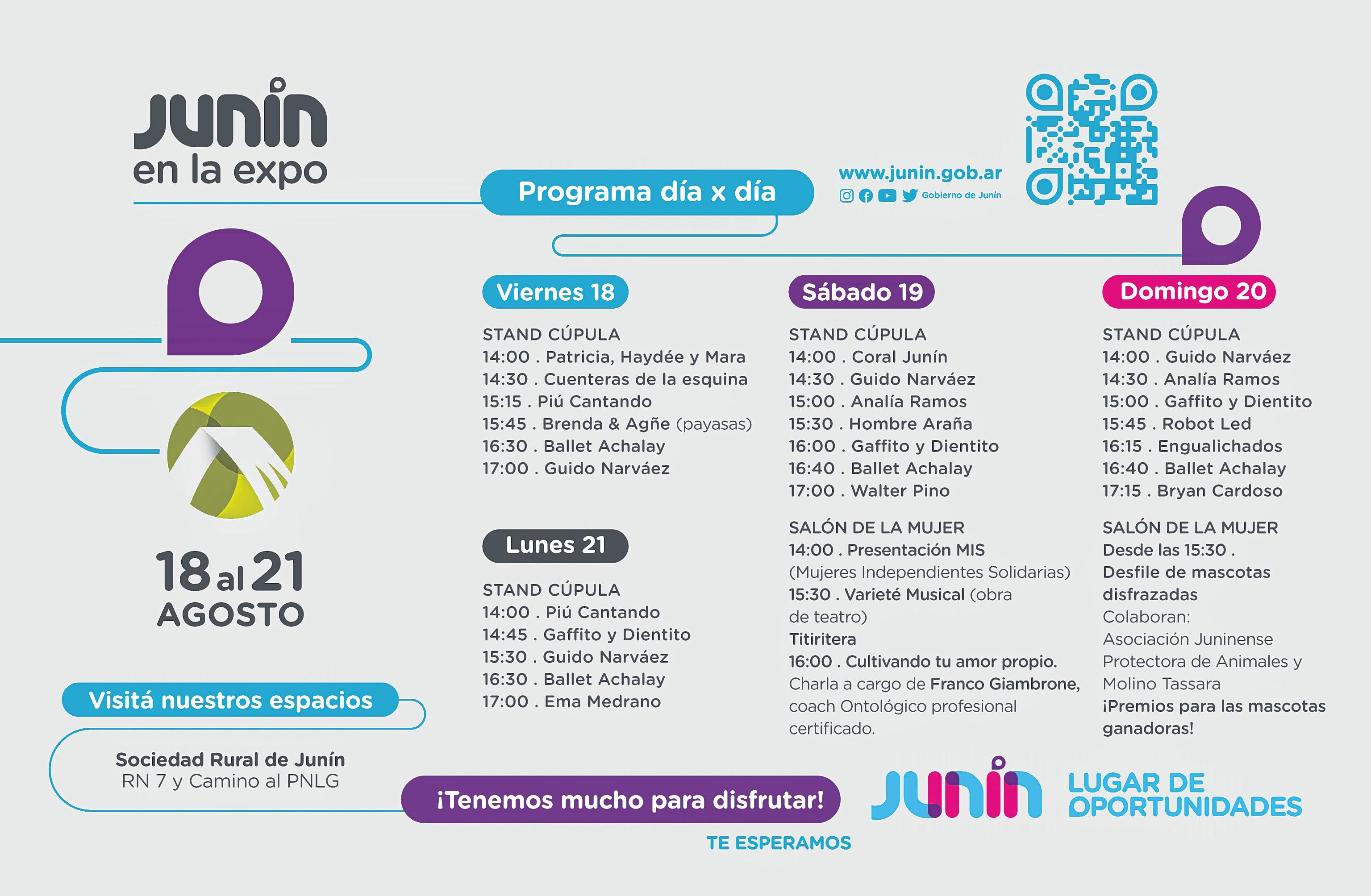 Hay dos propuestas dentro de la Expo Junín: el Paseo de Emprendedores donde estará el programa Comprá en Junín; y el stand institucional y propuestas culturales con eventos todos los días como danzas clásicas y música.