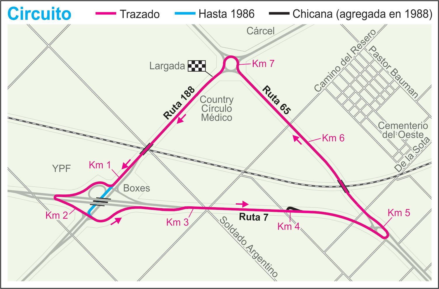 Nezio y Martínez Boero, Sasso y Occhionero, y las diez filas restantes. Las parejas largarían cada 7 segundos, por lo que la última partiría al minuto y 45 segundos de los punteros, cuando éstos ya habrían recorrido más de dos tercios del circuito. Era esperable, por lo tanto, que los primeros alcanzaran rápidamente a los últimos. El circuito tenía tres rectas principales. La más larga era la de la ruta 188, de 1500 metros. La de la ruta 7 era de 1300 y la de la 65, de 1200. Teniendo en cuenta que los autos eran capaces de recorrer mil metros en menos de 15 segundos, estas rectas eran consideradas “cortas” para el TC. Por este motivo, los factores determinantes eran la buena salida de abajo, la capacidad de frenado y el equilibrio de las suspensiones. Tras la largada, Satriano se adelantó a Marcos, y Castellano hizo lo propio con Mouras. Al pasar por el primer control, Castellano quedó como puntero por tiempo, seguido por Mouras y Satriano. En la segunda vuelta los punteros quedaron alineados; recorrieron toda la recta de la ruta 188 y finalmente al doblar en la curva del puente, Mouras superó a su principal competidor en la lucha por el campeonato. Poco a poco, el casarense comenzaría a escaparse en la punta. Poco después se producía el principal incidente de la carrera, cuando los punteros comenzaron a alcanzar a los rezagados sobre la ruta 188, al pasar debajo del puente de la ruta 7. Osvaldo Lynn entró en trompo mientras estaba siendo alcanzado por Satriano y Mouras, que venían superando por adentro a Rubén Blanco y Eduardo Marcos. Satriano logró esquivarlo, pero Mouras no tuvo tiempo y aplicó freno total, al tiempo que Marcos lo golpeaba de atrás. A ambos