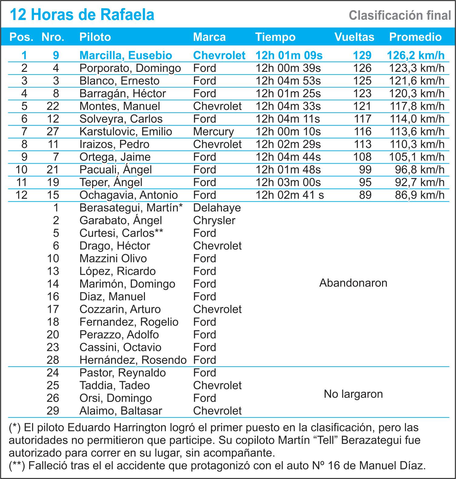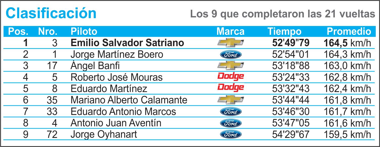 hora. El de Chivilcoy no fue presionado por sus seguidores, por lo que reguló la carrera y aun así logró una diferencia de 13 segundos sobre Juan De Benedictis. Tercero se ubicó Hugo Pacchialat, cuarto Octavio Suárez y quinto Osvaldo Lynn. El récord de vuelta lo marcó Satriano en el 5º giro con 2 minutos y 31 segundos a 164,5 kilómetros por hora. Los 28 mejores registros quedaron habilitados para tomar parte en la final a 21 vueltas. En la primera fila largarían Mouras y Martínez Boero. Luego irían largando por parejas cada siete segundos. En la segunda fila estaban Satriano y Calamante, en la tercera Antonio Aventín y Traverso,