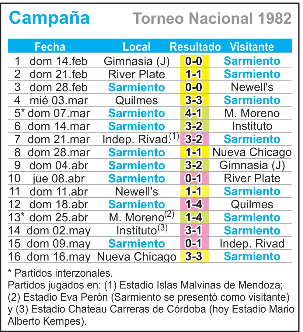 El Campeonato Nacional de 1982 continuó disputándose durante la Guerra de Malvinas. Tras el desembarco argentino en las islas, ocurrido el viernes 2 de abril, Sarmiento recibió a Gimnasia y Esgrima de Jujuy el domingo 4. Durante el segundo tiempo del partido disputado por Sarmiento en Córdoba, ante Instituto, el domingo 2 de mayo, se produjo el hundimiento del crucero General Belgrano.
