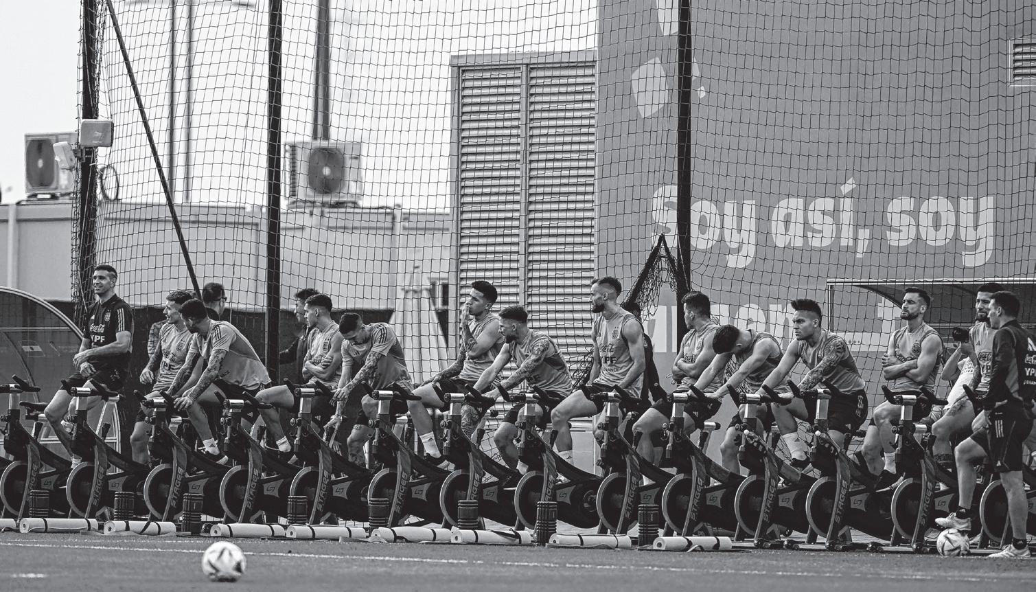 Enzo Fernández, Julián Álvarez, Lautaro Martínez, Nicolás Tagliafico, Rodrigo De Paul, Nicolás Otamendi y Ángel Di María iniciaron la sesión en las bicicletas fijas ubicadas a un costado de las canchas de la Universidad de Qatar.