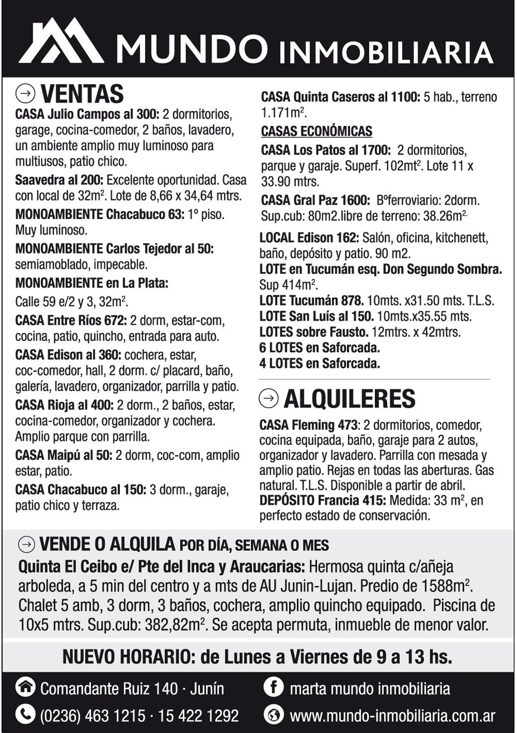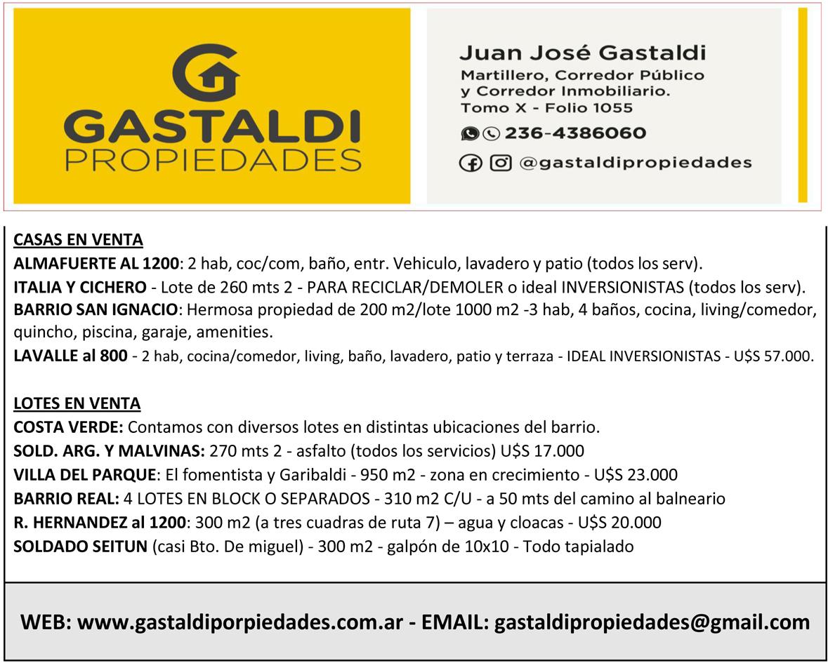 P ROPIEDADES Martillera y Corredora Pública - Tomo 9 Folio 989 Italia 860 - 2364371318 - 2364654544