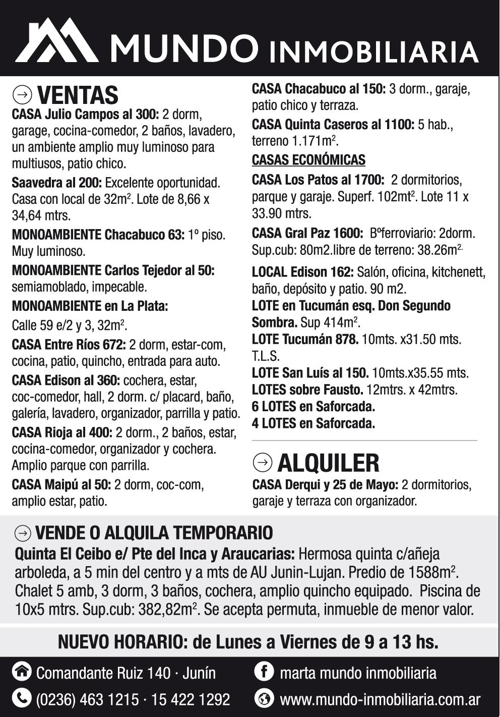 Con gas naTuRal. saFoRCaDa; 2.25 has a 4 CuaDRas De la Plaza. baRRIo RaMón CaRRIllo en CaMIno Del ReseRo enTRe CTe esCRIbano y boRges loTe De 5.000 M2 (50x100) ALQUILO CASA J unín , Z ona dr ca L p Y bto de migue L. S e re Q uiere garantía inmueb L e en J unín o L a Z ona W hat S app (236) 4382936 84113 10/10 tv Publicite en incremente el alcance de su negocio. >El noticiero de la Ciudad, de lunes a viernes a las 12.30 y a las 20 Siempre con vos Seguinos en nuestras redes sociales