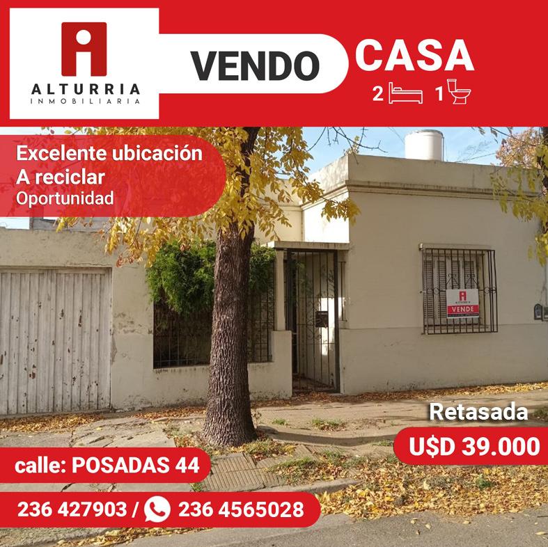Casa: sobre Rioja 384, living, cocina com., baño, 2 dorm., baño de servicio, cochera pasante, buen estado, terreno 10 mts. x 41 mts. aprox.