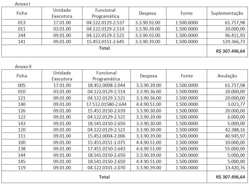 Art. 2º Os recursos necessários à execução do dispositivo no artigo anterior decorrerão das anulações de dotações orçamentárias constantes do Anexo II deste Decreto, conforme disposto no artigo 43, parágrafo 1º, Inciso III da Lei Federal nº 4.320, de 17 de março de 1964;