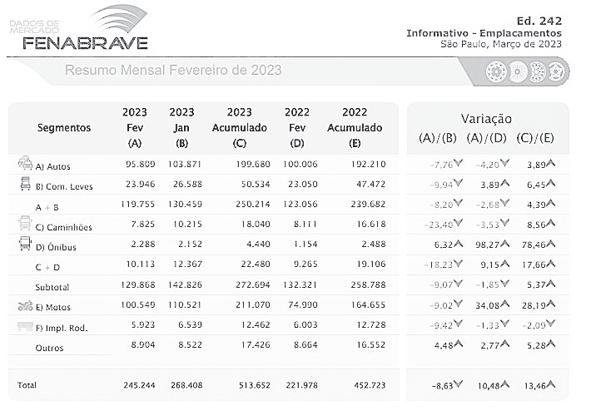 Presidente da Fenabrave. Segundo ele, dados os desafios conjunturais, como a alta taxa de juros e a sazonalidade de início de ano, os resultados são positivos. “Praticamente, todos os segmentos registram alta no acumulado do bimestre, em relação a 2022, com destaque para o mercado de motocicletas, categoria que tem boa expectativa de crescimento para este ano, segundo nossas projeções”, conclui Andreta Jr.