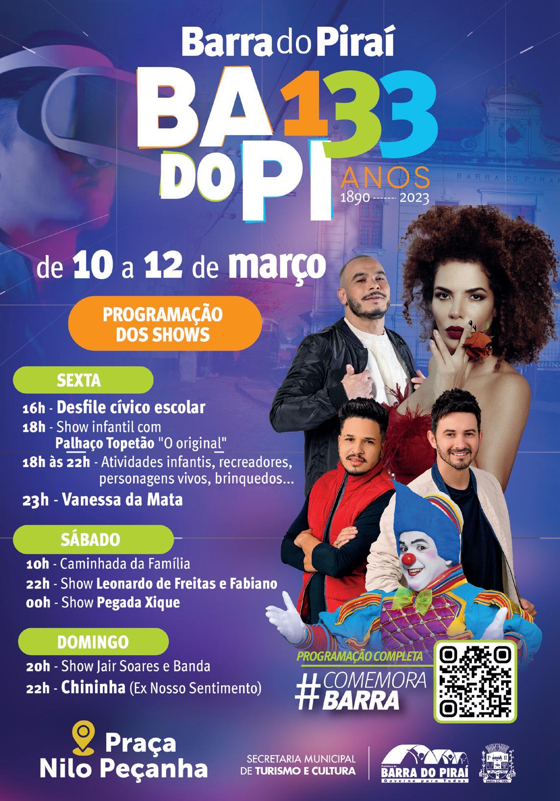 No dia 10 de março a cidade de Barra do Piraí completa 133 anos e traz uma programação com diversos shows. Nos dias 10, 11 e 12, a Praça Nilo Peçanha, no Centro da cidade, receberá gran-