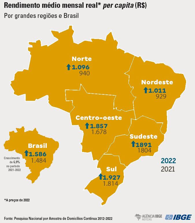 ficiente de Gini, mensura a igualdade ou desigualdade de distribuição de renda num determinado território De acordo com o levantamento, a região Nordeste segue com menor rendimento médio mensal domiciliar per capita (R$ 1.011), enquanto a Sul tem o maior (R$ 1.927). Já o percentual de pessoas com rendimento na população do país subiu de 59,8% em 2021 para 62,6% em 2022.