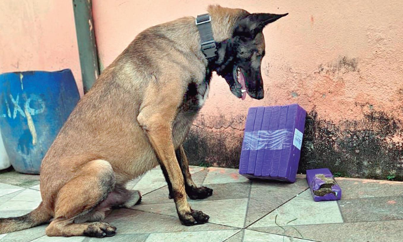 Um dos agentes caninos da PM ao lado de drogas que ajudou a localizar