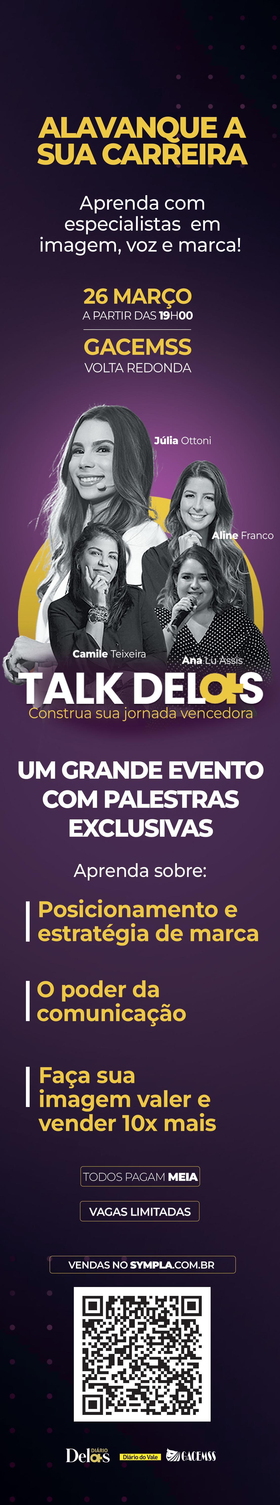 O ‘Talk Delas’ é promovido pelo Portal Diário Delas, do DIÁRIO DO VALE, e é completamente voltado para o público feminino – para as mulheres que já empreendem e para as que querem empreender. O encontro é uma conferência no estilo TEDx e contará com a presença de mulheres de sucesso que obtiveram destaque em suas áreas de atuação. Uma oportunidade única para que as mulheres da região possam absorver conteúdos para alavancar suas carreiras ou para dar o primeiro passo rumo à concretização de seus sonhos profissionais.