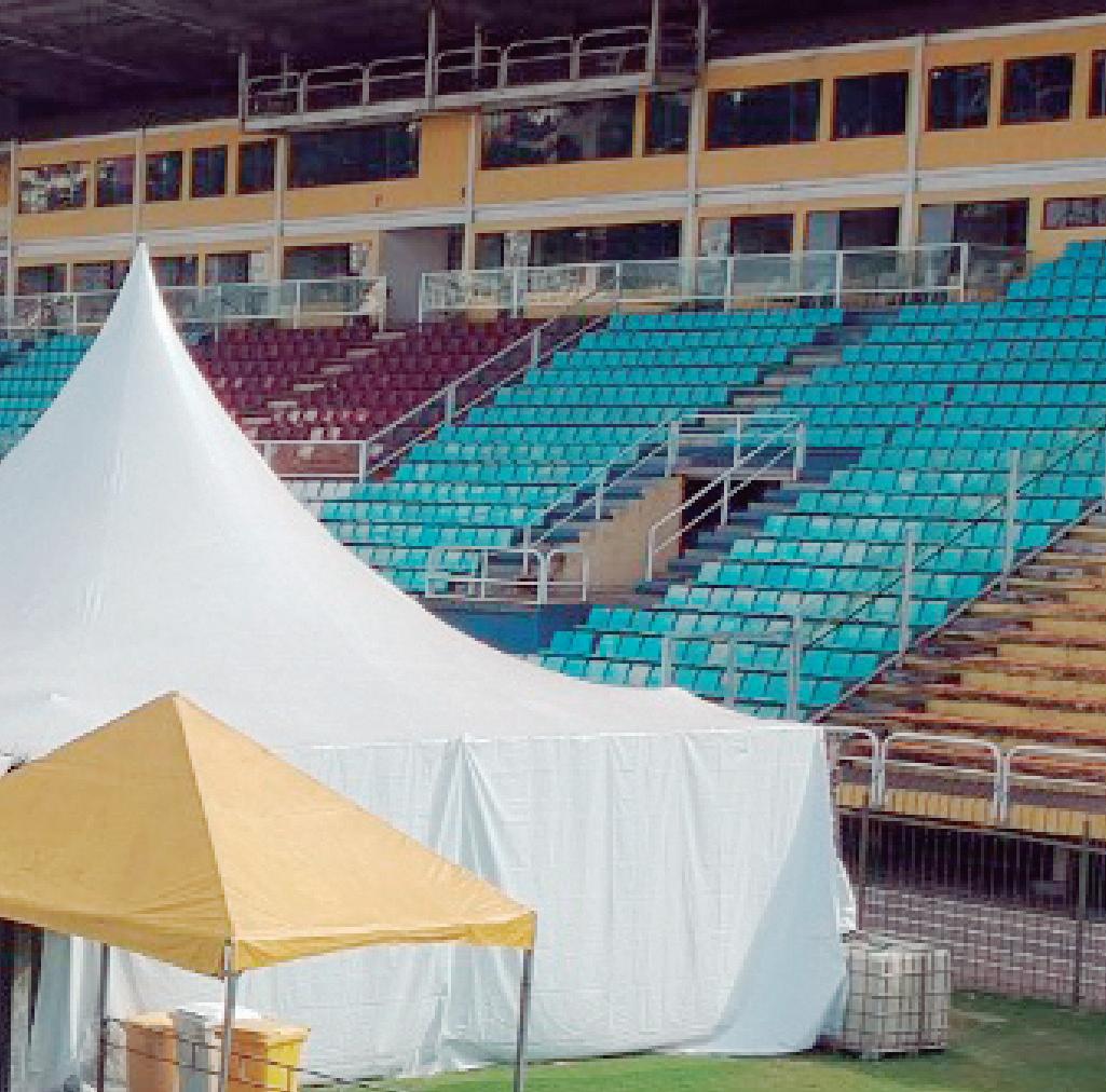 do hospital de campanha instalado sobre o gramado do Estádio Raulino de Oliveira, em 2020, durante a pandemia de Covid-19. A unidade de saúde tinha por