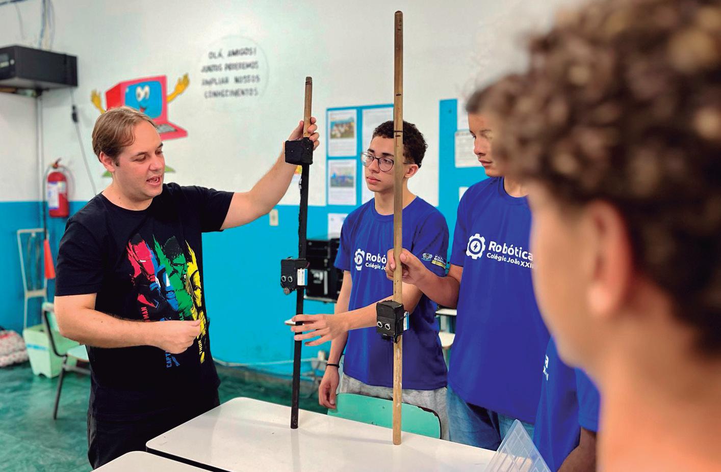 visuais. Ao utilizar a robótica para melhorar a mobilidade e a independência de pessoas com deficiência, este projeto reforça a ideia de que a tecnologia pode e deve ser uma aliada na superação de barreiras físicas e sociais”, frisou Eliete. Professor de Robótica e mentor dos alunos na ideia da Bengala Inteligente, Frederico Pitasse, destacou a questão social da iniciativa. “Aqui, a gente trabalha muito com competição, mas sempre nos preocupamos também com o social. E a partir das ideias dos alunos, juntamente com a secretaria, nós desenvolvemos a bengala inteligente, que é o nosso protótipo, onde a gente vem trabalhando para ajudar de uma forma geral a população”, ressaltou Frederico. Aluno do projeto de robótica e membro da equipe que está desenvolvendo a Bengala Inteligente, Luiz Filipe Pires, contou como é participar da iniciativa. “É bem mais gratificante do que participar de uma competição, em um campeonato você ganha no máximo uma medalha, neste projeto nós mudamos a vida de muitas pessoas”, salientou.