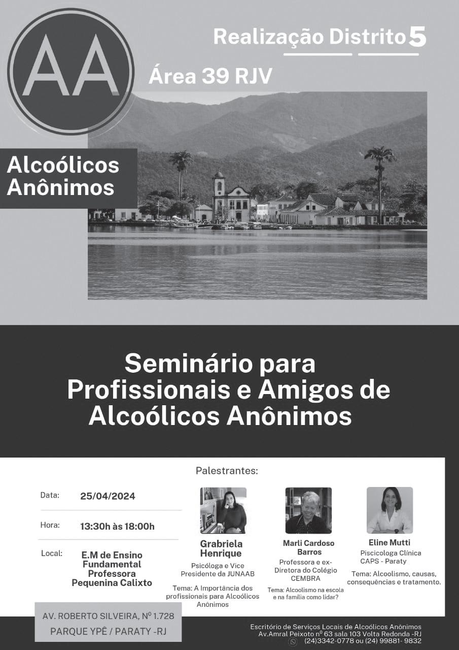 O 5º Distrito de Alcoólicos Anônimos (AA), da área 39RJV, promove nesta quinta-feira (25) um seminário voltado para profissionais e amigos de alcoolistas. O evento, que acontece na Escola Municipal Professora Pequenina Calixto, tem por objetivo fornecer uma visão clara e completa da instituição e de