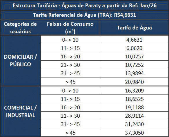 Águas de Paraty, Concessionária dos Serviços Públicos de Abastecimento de Água e Esgoto na área urbana do Município de Paraty, torna público, na forma do artigo 39 da Lei 11.445/ 07, em consonância com a Cláusula 20 do Contrato de Concessão e do Processo Regulatório n°. SEI-480002/009982/2025, que as Tarifas Referenciais de Água (TRA) e Serviços Complementares passam a vigorar, a partir das faturas com referência no mês de janeiro de 2026, com aplicação do reajuste anual de 3,967% (três inteiros e novecentos e sessenta e sete milésimos por cento) referente ao reajuste tarifário ordinário anual e 2,72% (dois inteiros e setenta e dois centésimos por cento) relativo a segunda parcela do realinhamento tarifário estabelecido na cláusula quarta do Terceiro Termo Aditivo ao Contrato de Concessão, que equivale à nova TRA (Tarifa Referencial de Água) no valor de R$ 4,6631 (quatro reais e seis mil seiscentos e trinta e um milésimo de real) a ser aplicada na Estrutura Tarifária e Tabela de Serviços de que trata o Anexo X do Contrato de Concessão. Em caso de dúvida, os clientes podem entrar em contato com a Águas de Paraty na loja de Atendimento ao Cliente: Lorival Valentim dos Santos, Vila Colonial, Paraty–RJ, ou através de nossos canais de relacionamento digital: Aplicativo Cliente Águas; WhatsApp 21 97211-8064;