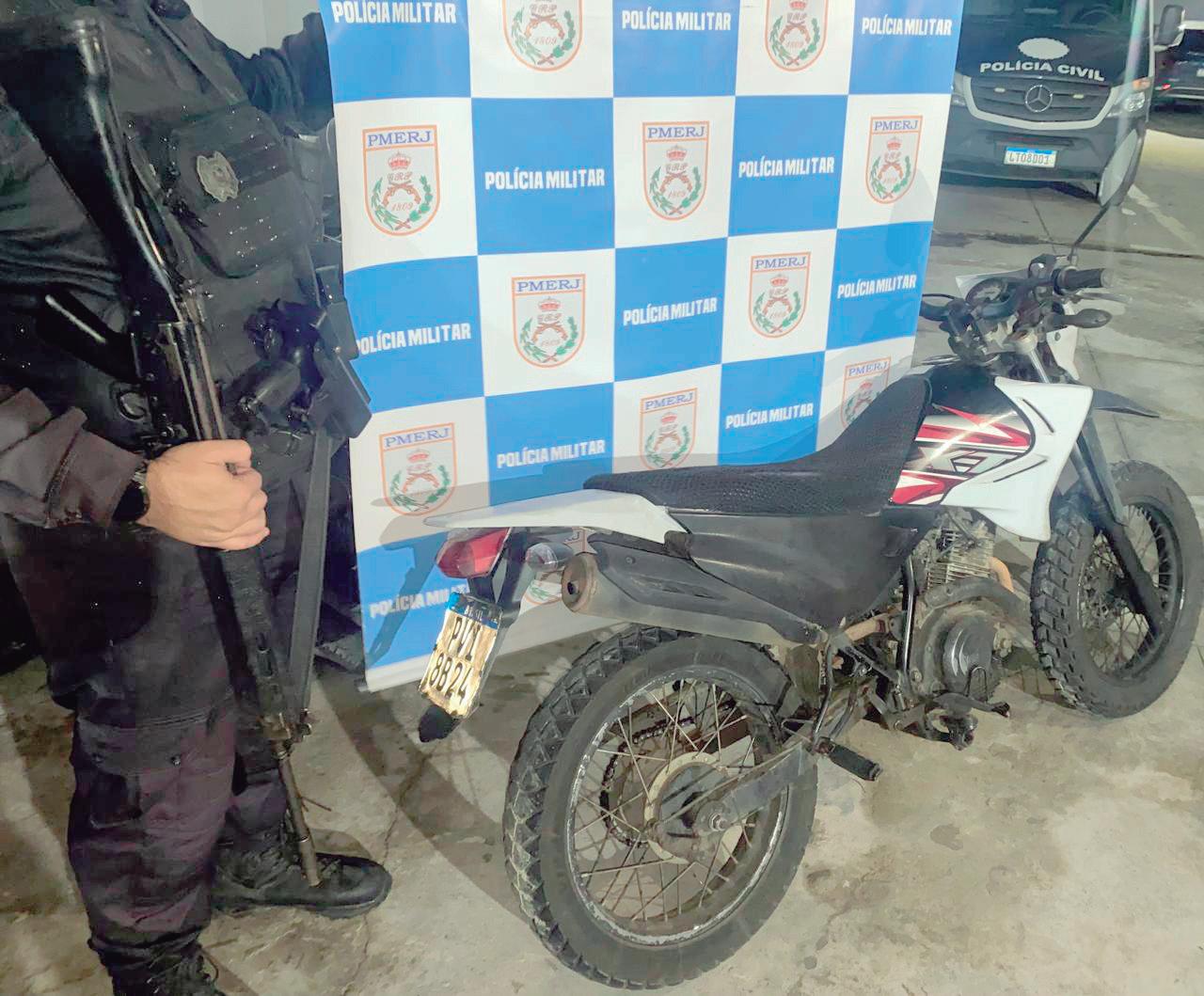 Uma motocicleta roubada e uma quantidade de drogas foram apreendidas pela Polícia Militar na noite de terça-feira (21), no bairro Jardim Cidade do Aço, em Volta Redonda. A ação ocorreu à noite, na Rua Frei Henrique Soares. Segundo a Polícia Militar, a equipe realizava patrulhamento quando recebeu informações sobre a prática de tráfico de drogas na região. No local, os agentes observaram um homem em atitude suspeita, que recebia dinheiro e entregava entorpecentes, o que caracterizou a venda de drogas.
