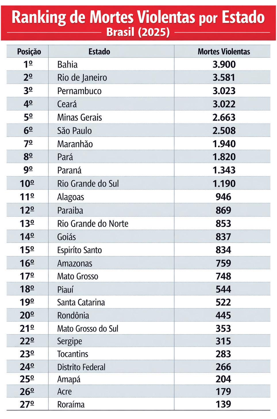 Apesar da redução nacional, a Bahia lidera o ranking absoluto de mortes violentas em 2025, com cerca de 3,9 mil vítimas. Na sequência aparecem Rio de Janeiro, com 3.581 óbitos, e Pernambuco, com pouco mais de 3 mil casos. As informações são dis -