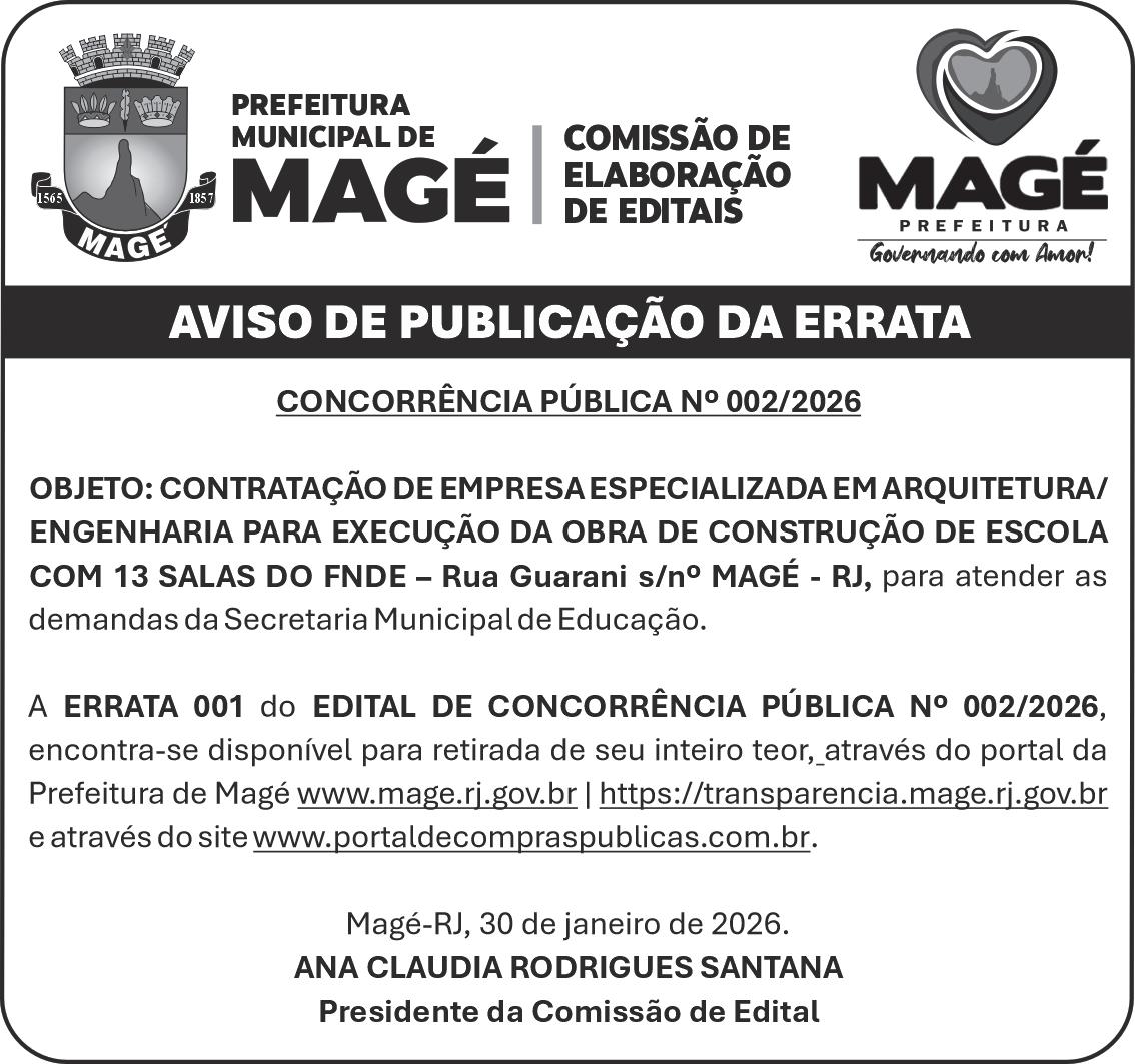 OBJETO: CONTRATAÇÃO DE EMPRESA ESPECIALIZADA PARA CONSTRUÇÃO DE UNIDADES HABITACIONAIS NO MUNICIPIO DE QUATISJ, EM ATENDIMENTO DO TERMO DE COMPROMISSO Nº970845/2024/MCIDADES/CAIXA; Os participantes serão credenciados e as propostas abertas no dia 18 de março de 2026 às 09:00 horas. O Edital está disponível para download em transparencia. quatis.rj.gov.br Quatis, 03 de fevereiro de 2026.