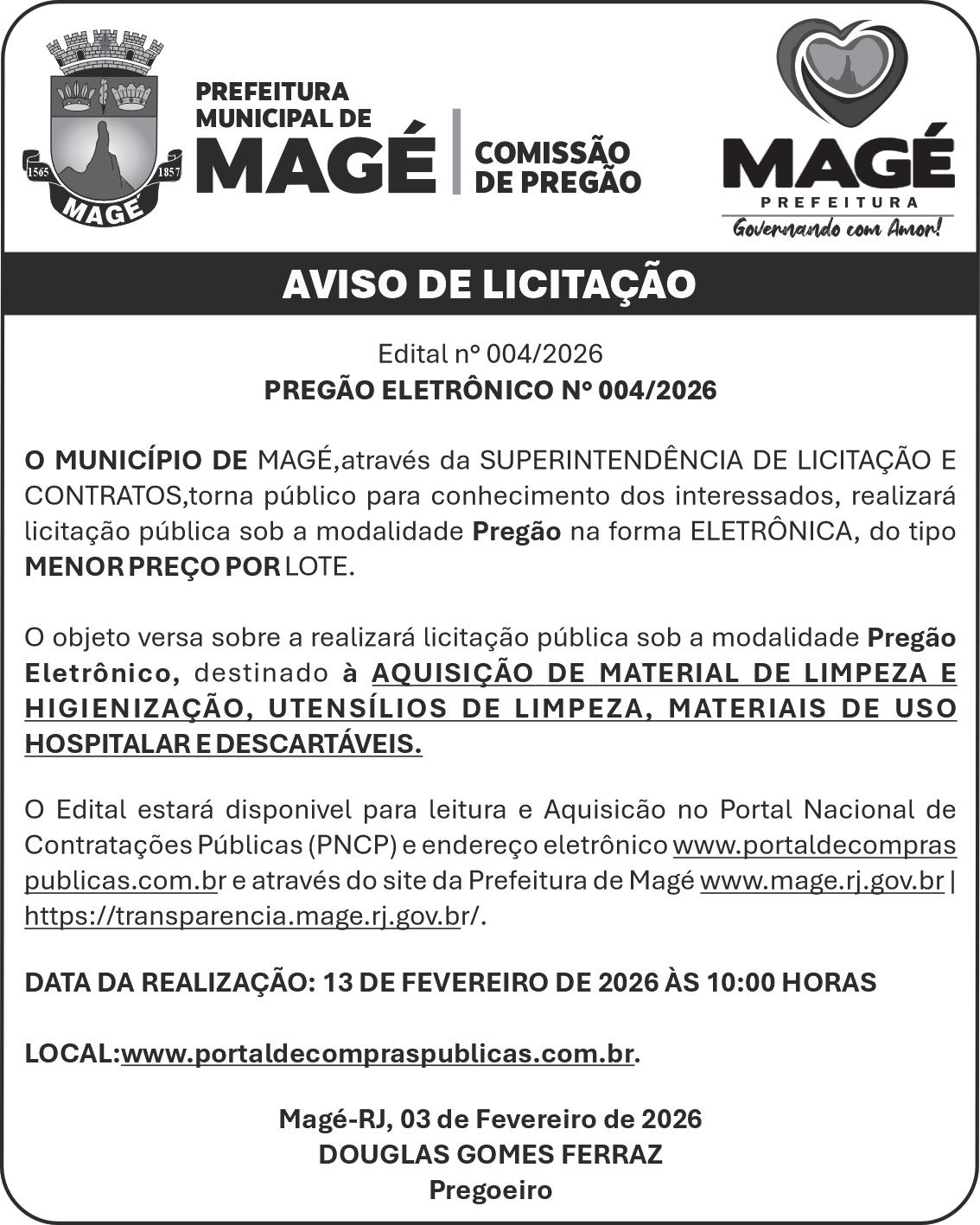 OBJETO: REGISTRO DE PREÇOS CONTRATAÇÃO DE EMPRESA ESPECIALIZADA EM FORNECIMENTO DE OXIGENOTERAPIA EM CÂMARA HIPERBÁRICA; A sessão de disputa do pregão iniciará no dia 25 de fevereiro de 2026, às 14:00hs, no Portal da Bolsa de licitações do Brasil-BLL no endereço www.bll.org.br. O Edital está disponível para download em transparencia.quatis.rj.gov.br Quatis, 03 de fevereiro de 2026.