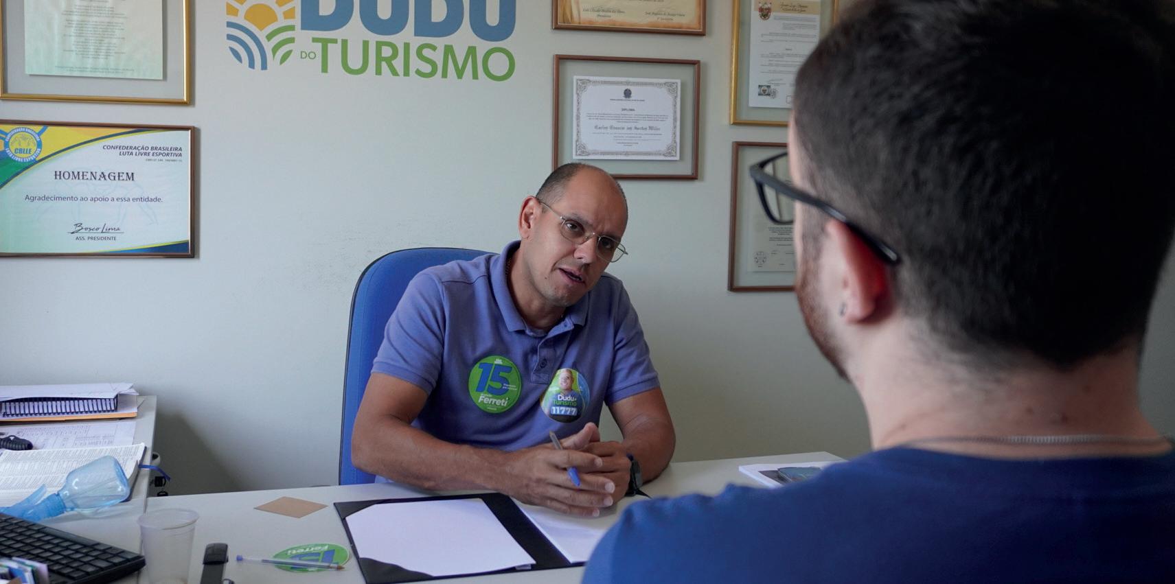 ativo na política local. Em 2020, Dudu conquistou uma vaga na Câmara Municipal, após anos de estudos e campanhas voltadas para as necessidades da população. Ao assumir o cargo, ele trabalhou para transformar a Comissão de Turismo em uma entidade autônoma, separando-a de outras comissões, como a de ação social e pesca. “Sou também presidente da Comissão da Ilha Grande, onde reconheço a necessidade de uma abordagem diferenciada; a Ilha Grande precisa de um olhar diferenciado em todos os aspectos”, a rma. Agora, em busca de um segundo mandato, Dudu quer mostrar aos moradores os motivos