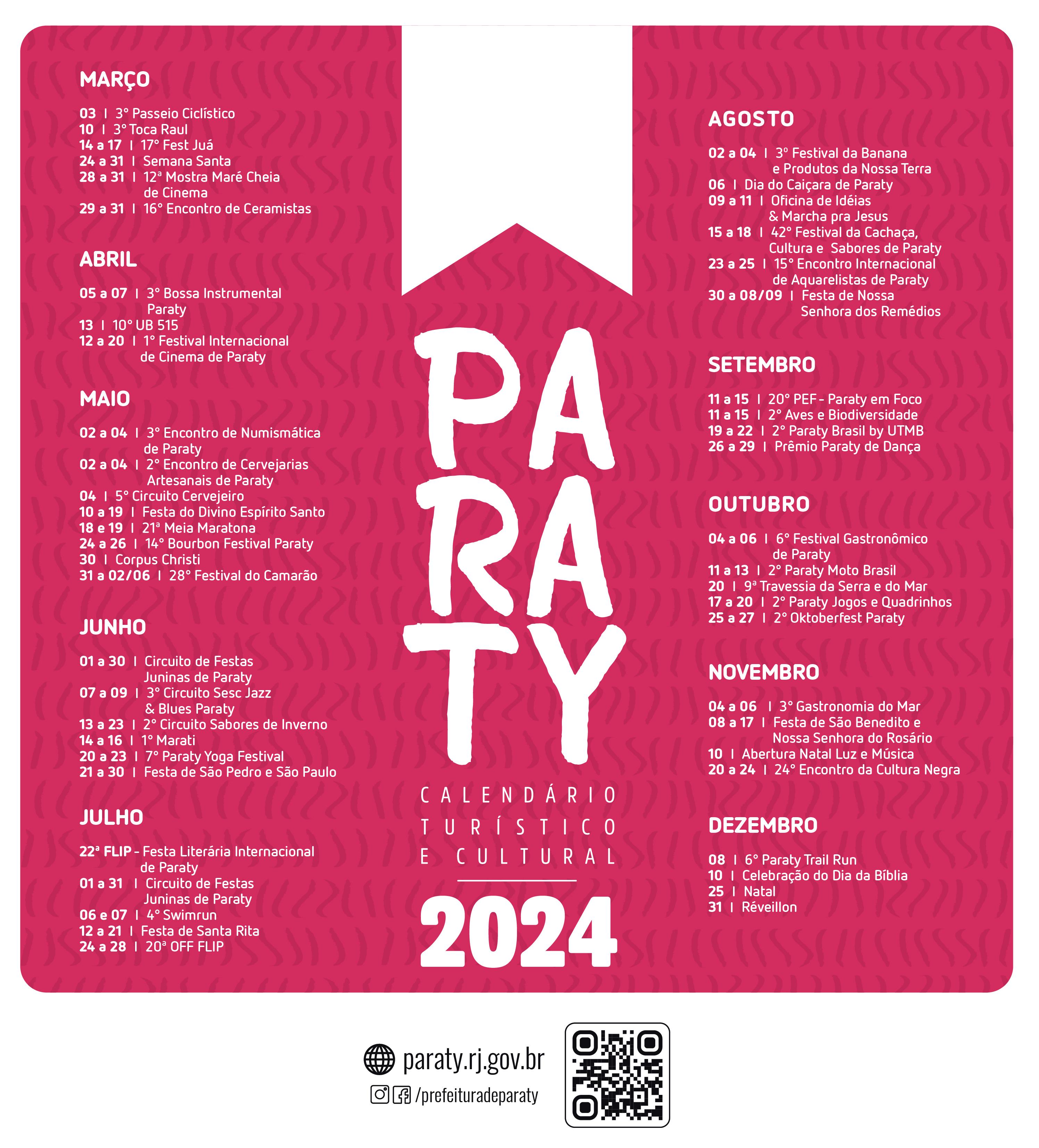 Considerado um dos eventos mais importantes e queridos do calendário artístico, cultural e turístico do Estado do Rio de Janeiro e da cidade de Paraty, o Bourbon Festival Paraty - www. bourbonfestivalparaty.com.br –chega para a sua 14ª edição nos dias 24, 25 e 26 de maio de 2024, sexta a domingo, com a abertura da Orquestra Sinfônica de Paraty e o Favela Bass, projetos musicais de inclusão social de jovens que se consagraram dentro da programação do festival e em cortejos pelas ruas do Centro Histórico.
