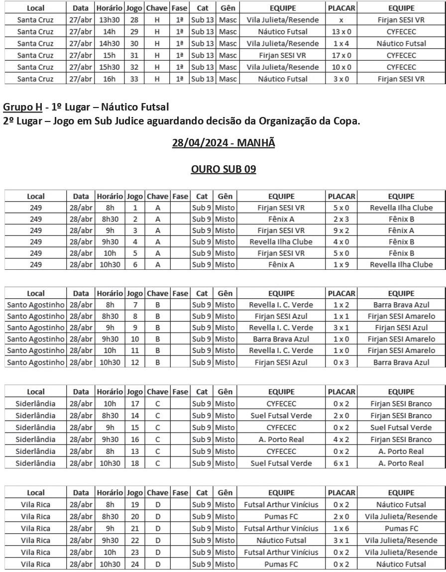 Ainda no Sub 13, a rodada foi complementada no período da tarde, porém pela Série Ouro, composta por agremiações de 32 instituições particulares de Volta Redonda e outras seis cidades da região. Os confrontos foram realizados nos ginásios dos bairros Santo Agostinho, Siderlândia, Vila Rica-Tiradentes, 249, Retiro e Santa Cruz.