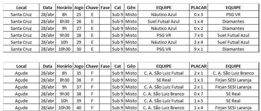 No domingo, dia 28, quem entrou em quadra foram os atletas da categoria Sub 9, Série Ouro. Eles disputaram um total de 36 jogos, que resultaram em 162 gols. Os duelos aconteceram pela manhã, nos ginásios bairros 249, Santo Agostinho, Siderlândia, Vila Rica-Tiradentes, Santa Cruz e Açude.