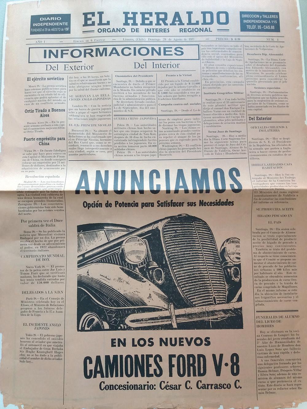 Hoy, 29 de agosto, es una fecha significativa para Diario El Heraldo de Linares, que celebra junto a la comunidad del Maule Sur sus 87 años de existencia, todo un hito para el periodismo local. De hecho, es el medio de comunicación más antiguo de la ciudad.