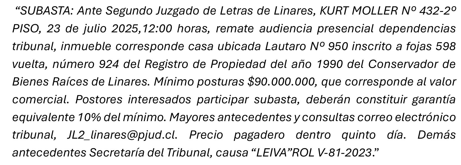 ANTE PRIMER JUZGADO LETRAS LINARES, mediante modalidad presencial, en recinto tribunal, calle Sotomayor 461, primer piso, Linares, con fecha 29 de Julio de 2025, a las 10:00 hrs., en cumplimiento de lo decretado en procedimiento ejecutivo obligación de dar rol número C-336-2021 caratulado “BANCO DE CHILE con ORTEGA DIAZ GUILLERMO” se rematará inmueble correspondiente a Sitio número 34 del Loteo Parque Quinto Centenario, de los en que se subdividió un retazo de terreno signado como Lote A-1, ubicado en la ciudad de Linares, y que corresponde a la Avenida Aníbal León Bustos sin número según sus títulos; actualmente dicho sitio corresponde a calle Los Inmigrantes número 01285 de la ciudad de Linares. Dicho Lote número 34 tiene una cabida aproximada de 782,87 metros cuadrados y deslinda: NORTE, en 21,50 metros con Estadio Español; SUR, en 21,51 metros con calle Los Inmigrantes; ORIENTE, en 36,64 metros con sitio número 35 del Loteo; y PONIENTE: en 36,18 metros con sitio número 33 del Loteo, inscrito a nombre del ejecutado don Guillermo Andrés Ortega Díaz a fojas 2214 vta., N°3495, del Registro de Propiedad del año 2007 del Conservador de Bienes Raíces de Linares. Rol Avalúo 520-34 Comuna Linares. Mínimo posturas 11.537 Unidades de Fomento según su equivalencia en pesos al día de la subasta, pagaderos dentro tercero día contados fecha remate. Para participar en subasta, interesados deben presentar vale vista a la orden del Tribunal tomado en el Banco Estado de Chile equivalente al 10% mínimo subasta, esto es 1.154 Unidades de Fomento, cuya conversión en pesos debe efectuarse al día del remate. Demás antecedentes y bases en causa indicada. EL (LA) SECRETARIO (A)