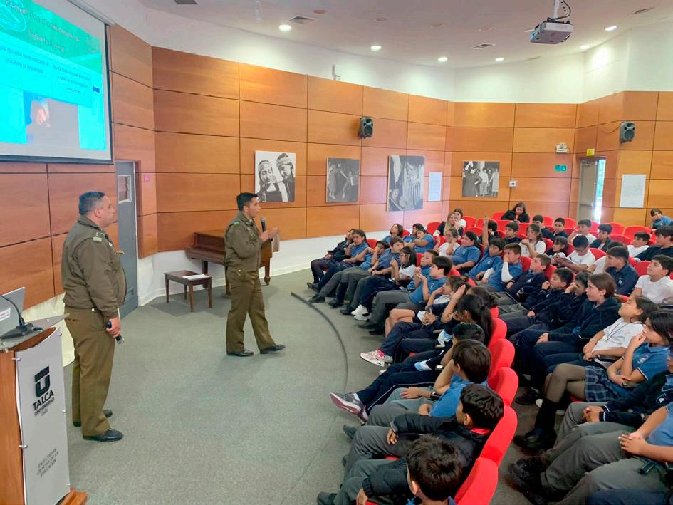 El encuentro presencial se realizó en dependencias del auditorio de la Sede de la Universidad de Talca, Campus Linares y fue liderada por el Sargento Primero Ariel Berner y el Sargento Segundo Damián Acevedo, ambos funcionarios policiales de la Subcomisaría de Carabineros “Cristián Martínez Badilla”, quienes desde el inicio del año escolar han estado visitando diferentes establecimientos educacionales del sector, para orientar, educar e instruir en temáticas tan relevantes, como la expuestas.