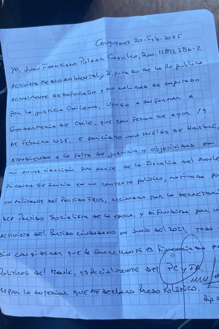 gar Castillo, activista medioambiental, Diputado de la República, actualmente desaforado y en calidad de imputado por la Justicia chilena, vengo a informar a Gendarmería de Chile, que a partir del 19 de febrero de 2025, he iniciado una huelga de hambre, atendiendo a la falta de justicia y objetividad en mi investigación por parte